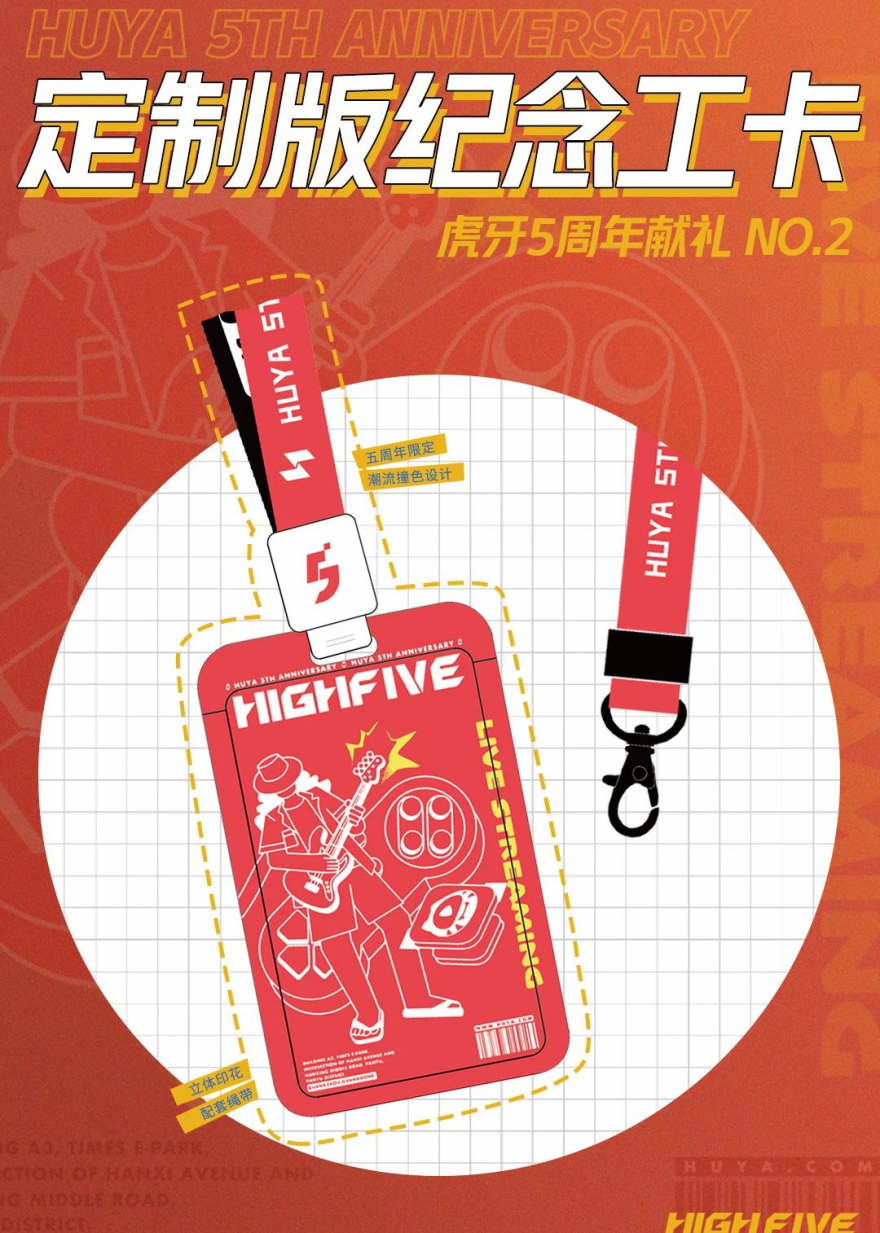 虎牙5周年除了定制T恤,还定制了纪念款工卡,让虎牙的酷guy酷girl的气质更拿捏到位。