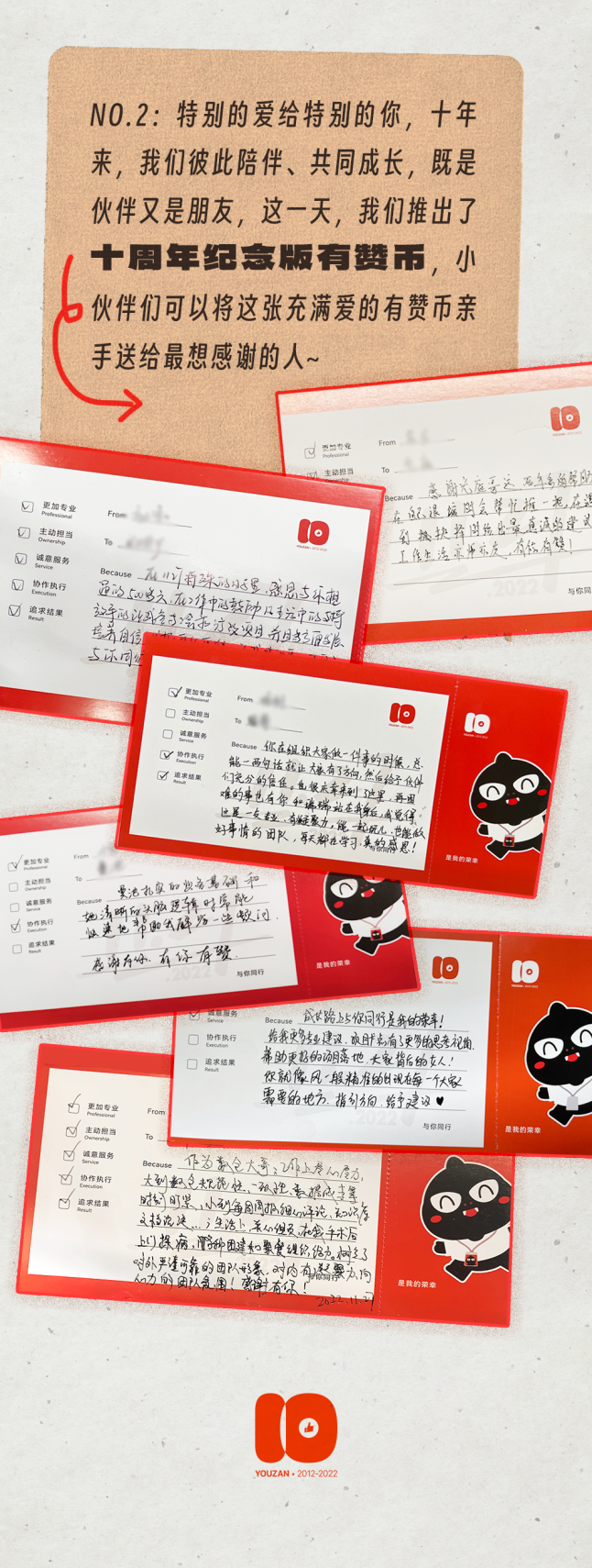 有赞10周年推出十周年纪念版有赞币,让员工将充满爱的有赞币送给最想感谢的人,感恩一同陪伴成长的伙伴!