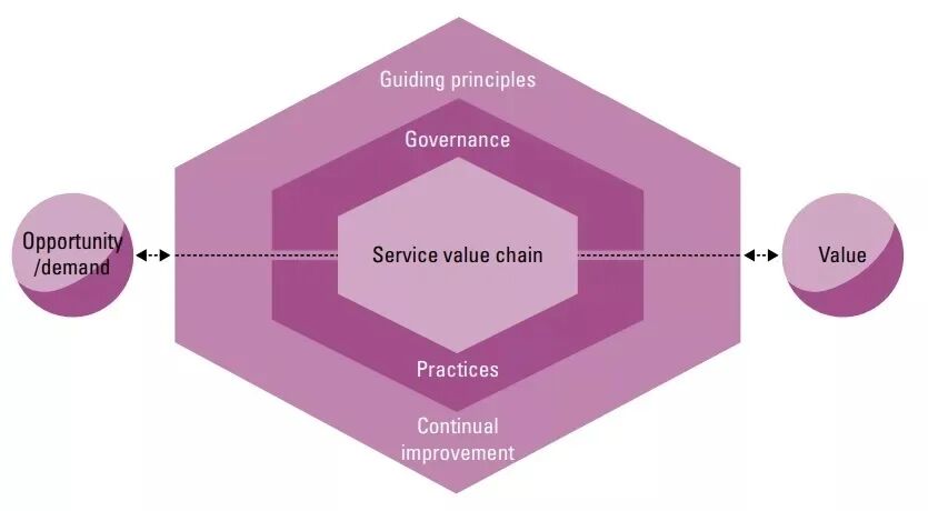 同时它也是一个用于说明组织的所有组件和活动如何协同工作以通过支持IT的服务促进价值创造的模型。