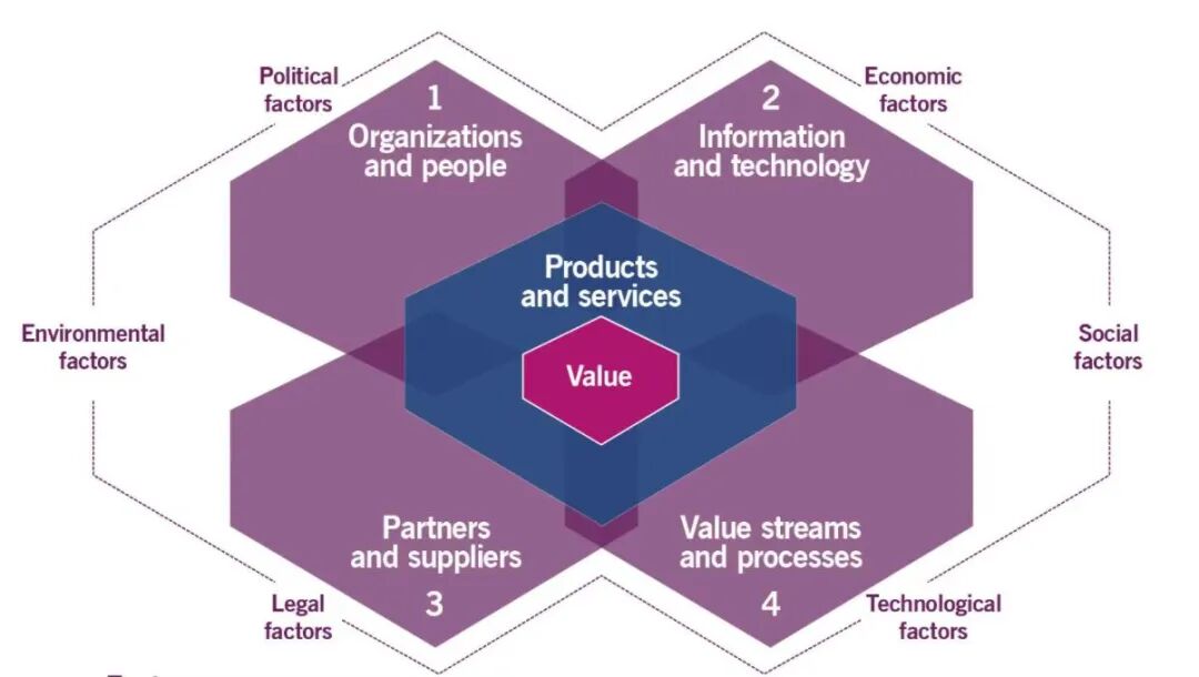 此外围绕这四个维度,ITIL4 特别提出许多外部影响因素的存在,包括:政治因素、经济因素、社会因素、技术因素、法律因素和环境因素。