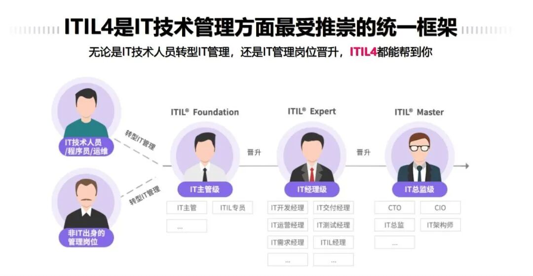 而对于IT行业的工作者,ITIL在IT服务管理领域来说具有绝对的优势,且在近几年不太可能出现更强劲的对手。ITIL可以帮助快速养成管理思维、并提供具体可操作的实践方法。