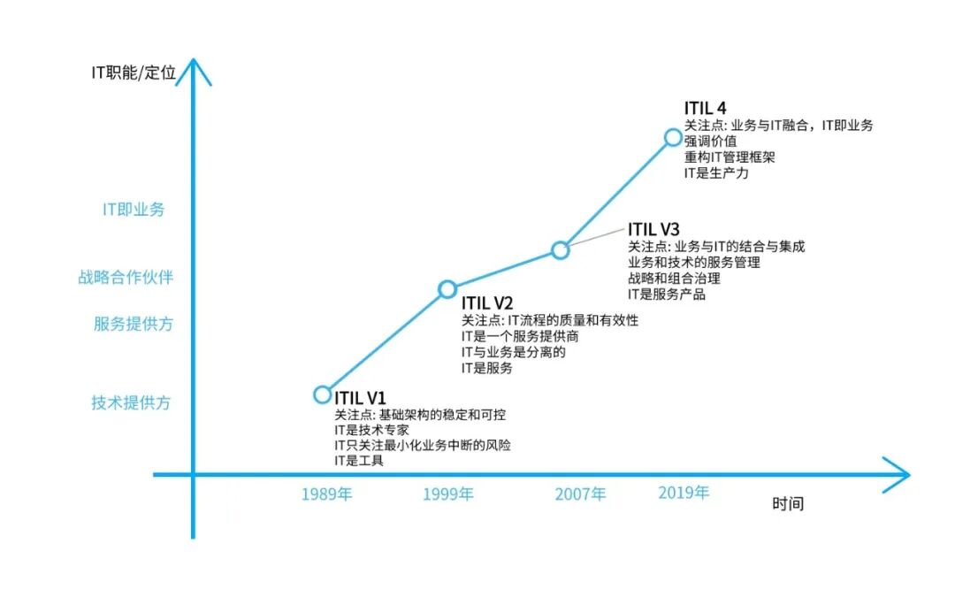 ITIL从发布至今一共经历4个版本,每一次版本的更新都是随着IT技术的飞速发展,一次又一次的IT与业务的深度融合。