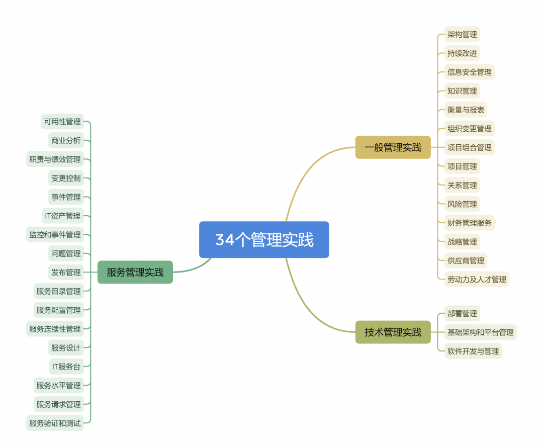 ITIL V3 的五个阶段里的26 个流程如今已被 ITIL 4中的34个实践所取代。这里说的实践就是以前的“流程”,可以定义为一套企业组织资源,旨在实现预期的目标。