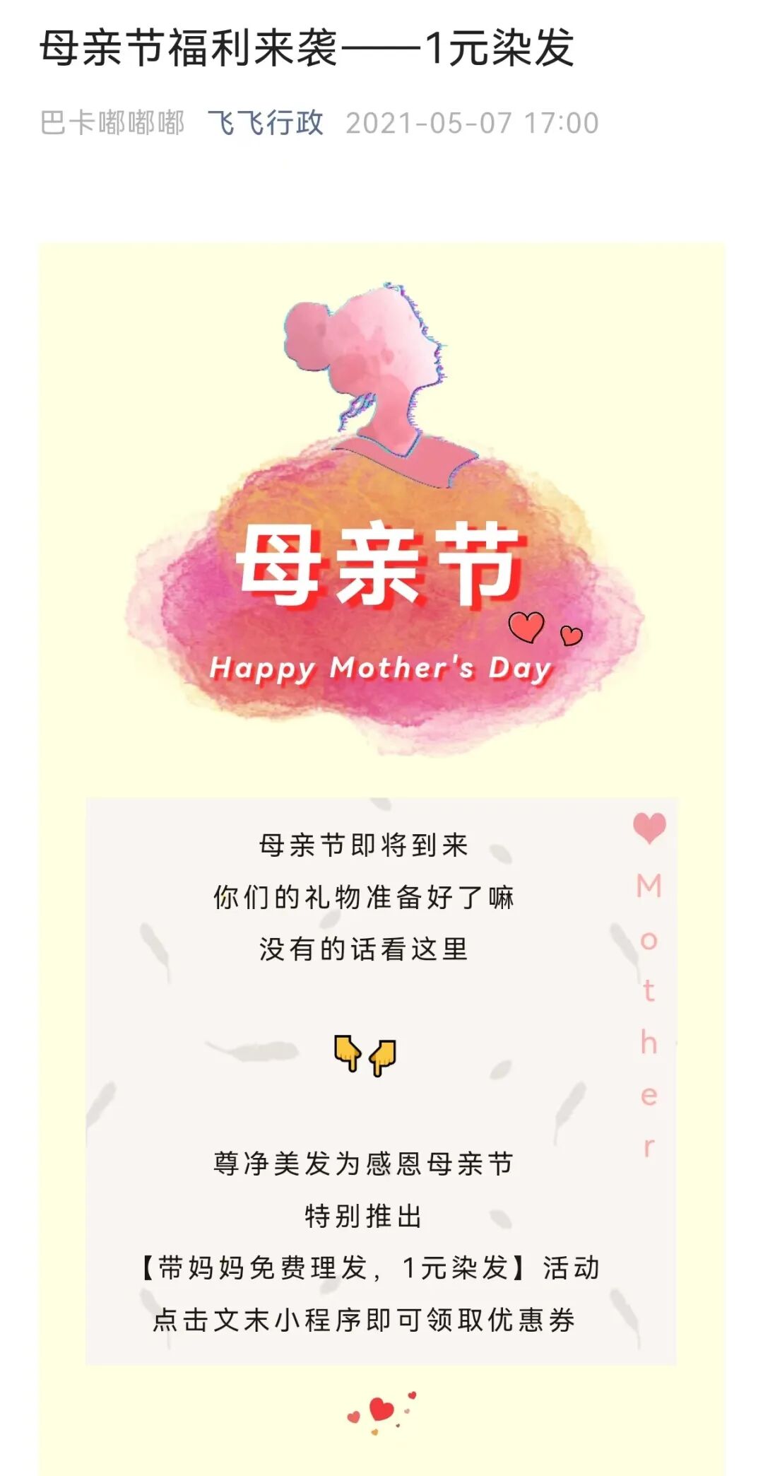 科大讯飞行政曾在母亲节为员工准备1元染发福利,联合商家推出「带妈妈理发,1元染发」活动~