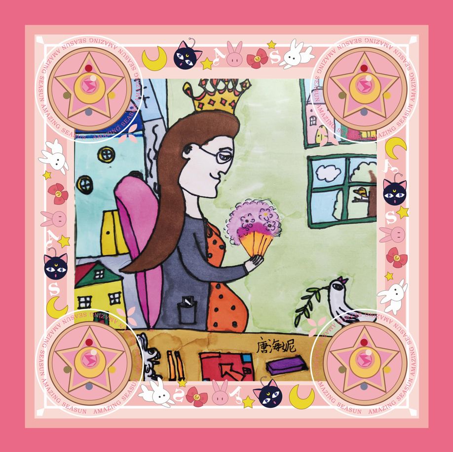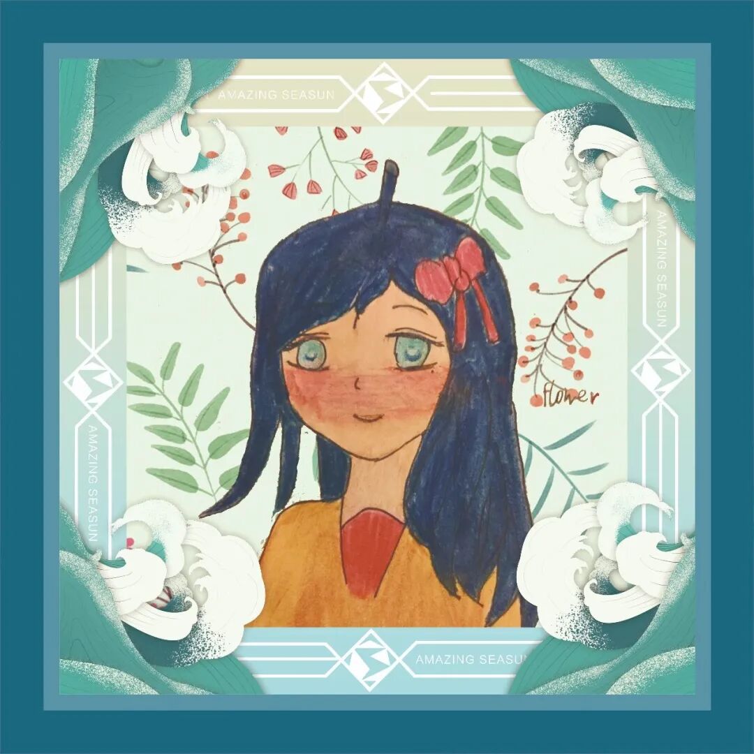 西山居行政将征集来的画稿进行剪裁、抠图等操作,嵌进西山居定制丝巾边框,也是很有意思的。