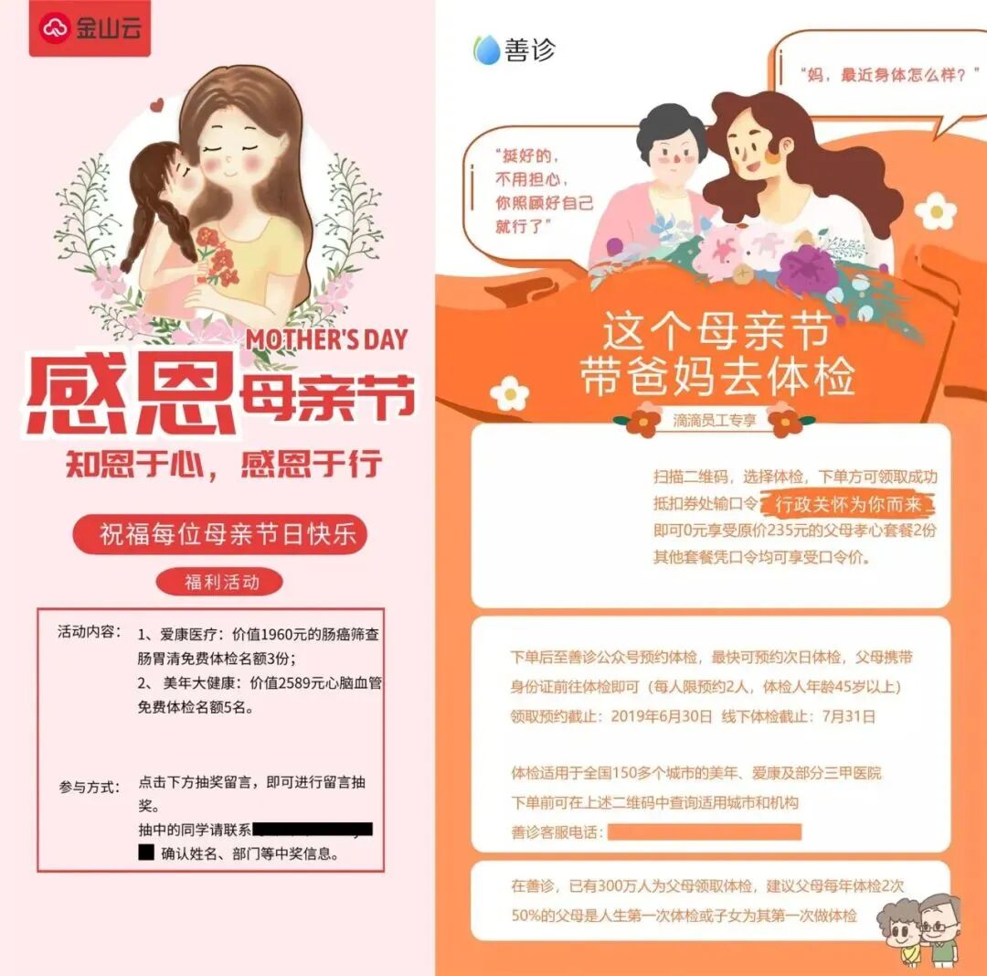 预算充足的企业可以考虑赠送员工父母体检福利、牙医福利等。也可以与大品牌机构谈下合作福利,给予员工一定优惠。比如金山云为员工母亲们准备过肠胃相关检查和心脑血管体检。