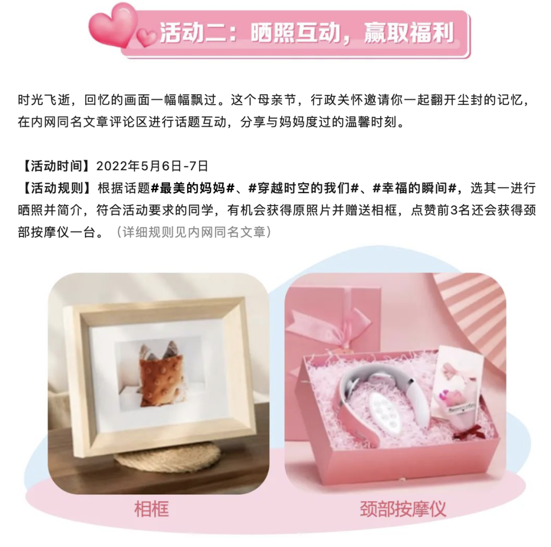 每当母亲节,都会有大批年轻人在朋友圈「晒妈」,那么各位行政人也可以为公司的员工们提供一个官方平台,比如凤凰网曾在内网组织“晒出最靓妈妈”的征集活动。