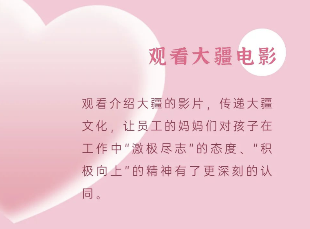 当然也可以播放公司的影片给员工的母亲,去年大疆给员工母亲播放介绍大疆的影片,传递企业文化的同时,还能让员工的妈妈们对孩子在工作中“激极尽志”的态度、“积极向上”的精神有更深刻的认同。