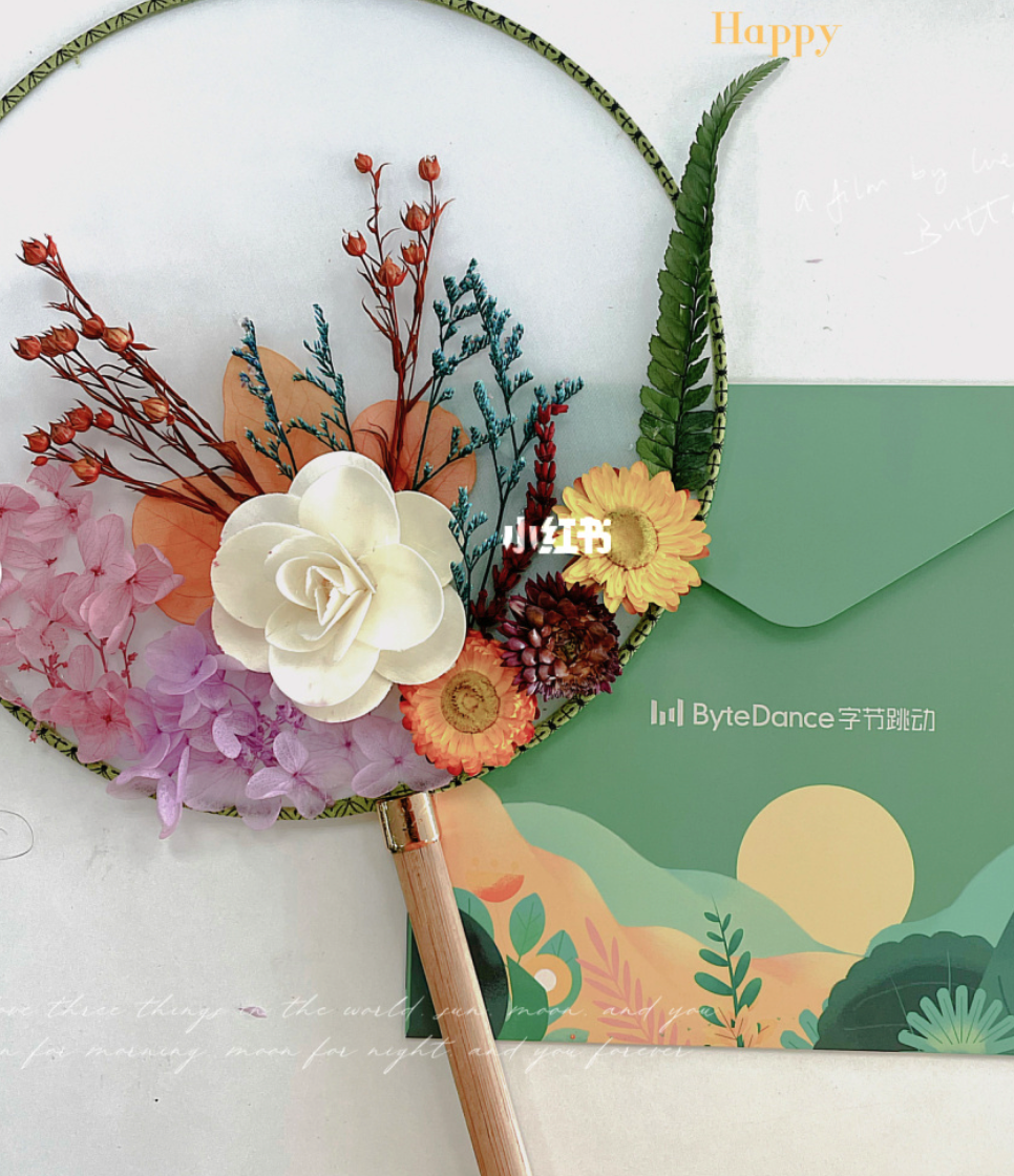 字节跳动也曾做过类似活动,在素净团扇上装饰干花,也是不错的选择哦!
