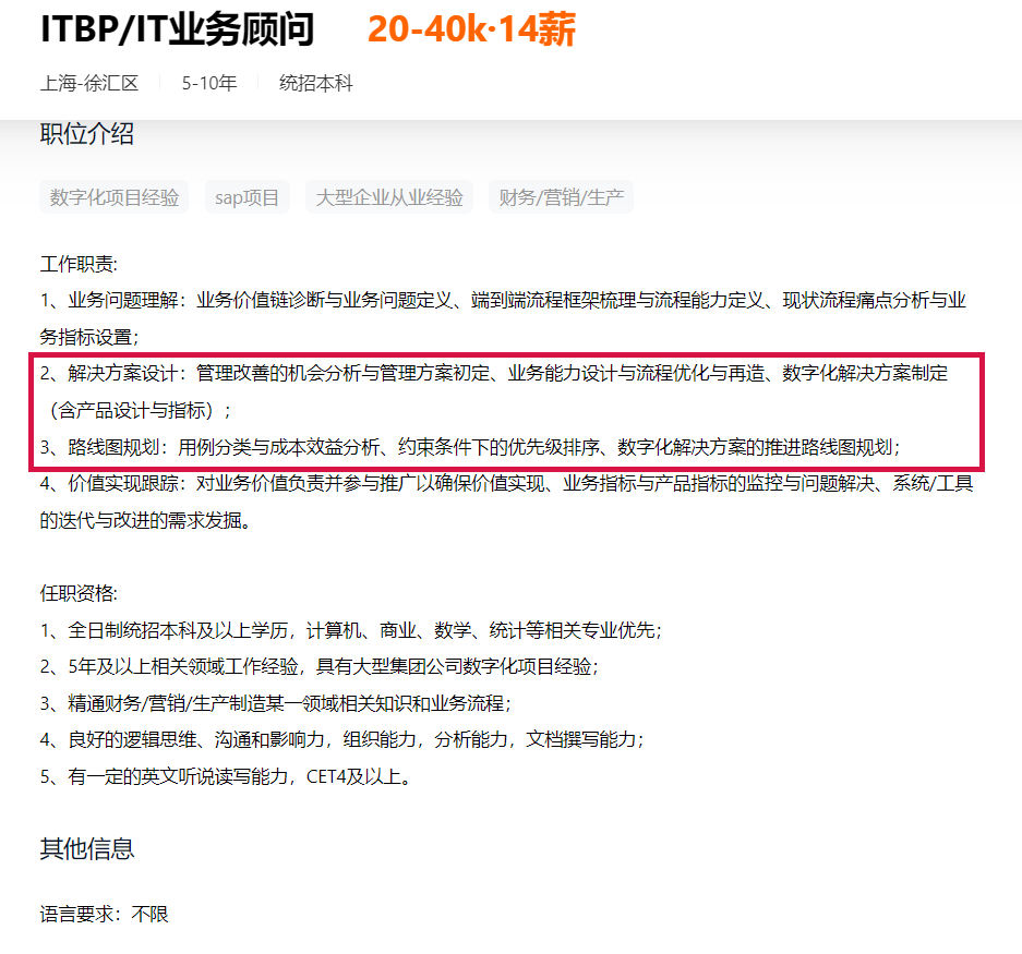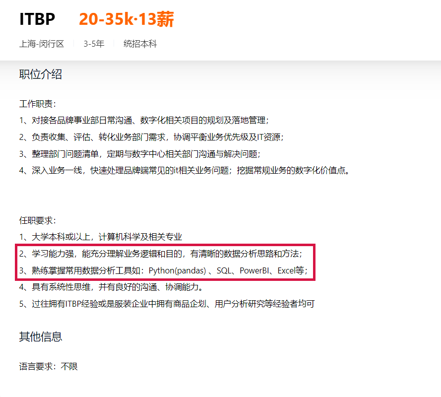 其中数据分析能力要求更多针对销售、运营、财务、人力行政等方面的ITBP,因为这些业务更依赖于从数据的角度呈现业务状态,也更需要通过数据分析来做出决策。