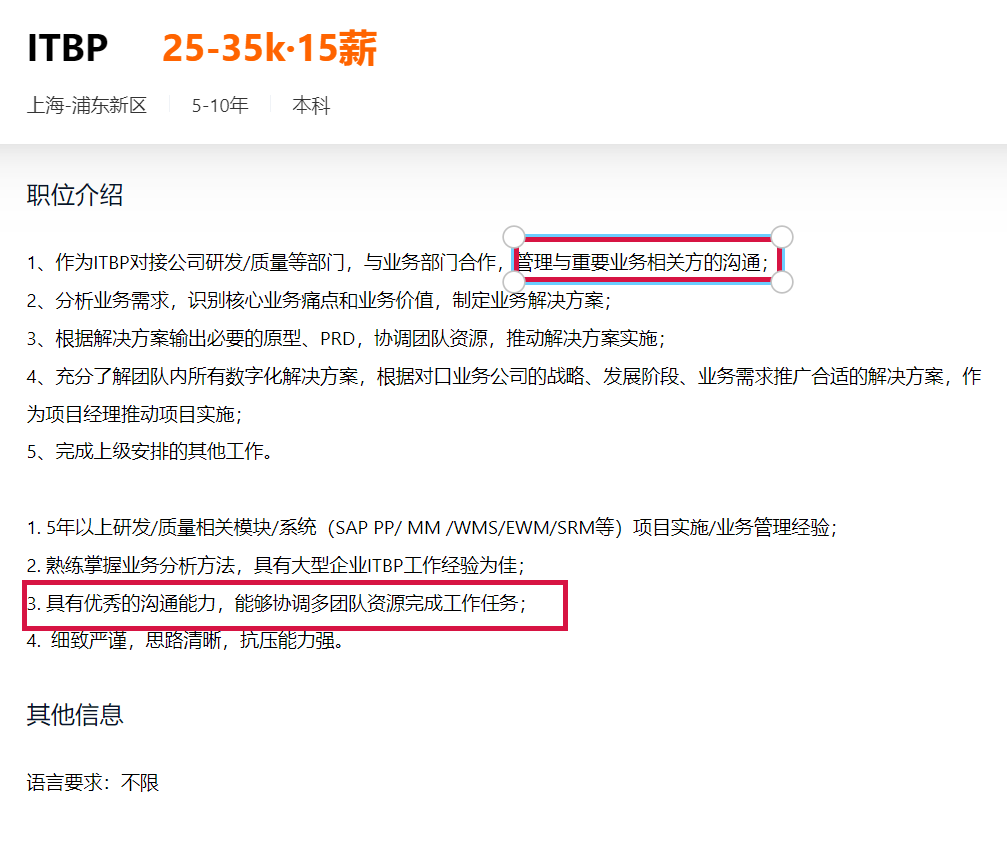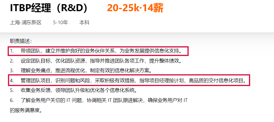 而项目管理者通常又扮演着领导的角色,因此有的ITBP则被要求需要具备团队领导能力,能够领导团队升级,并指导 IT 团队,协助业务部门实现其目标。