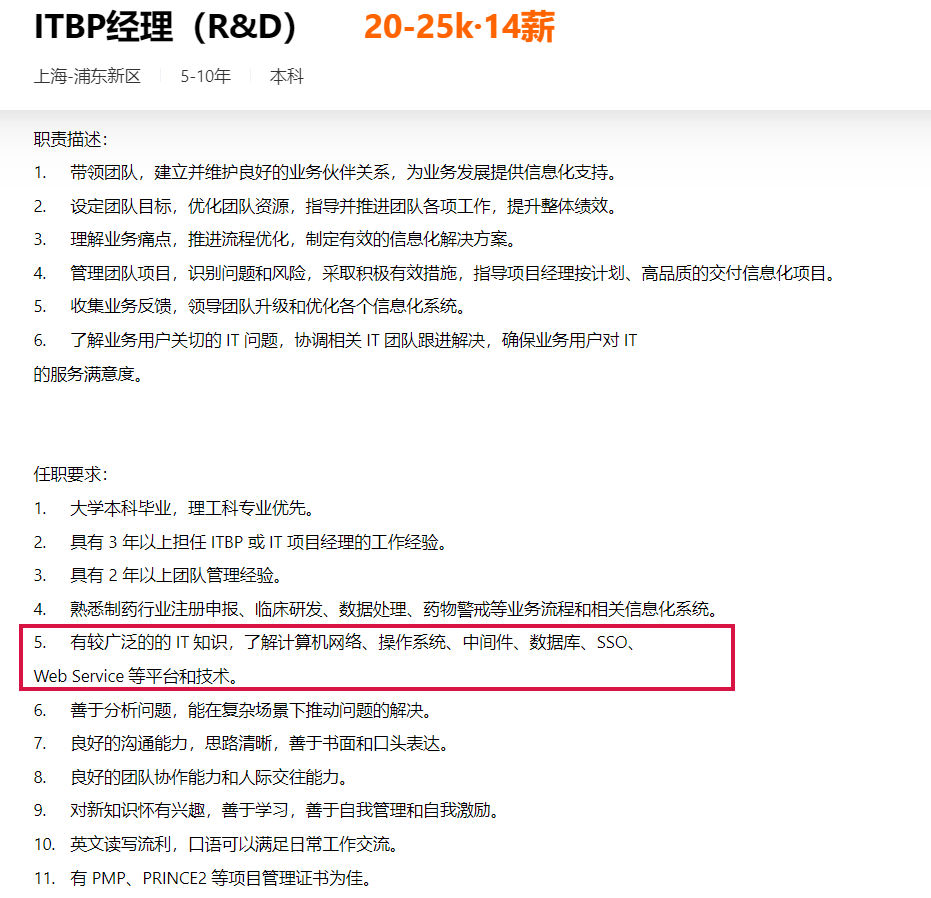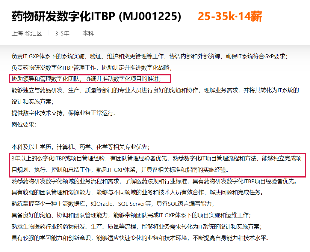 熟悉药物研发数字化领域的业务流程和需求,具有药物研发数字化ITBP项目经验者优先;