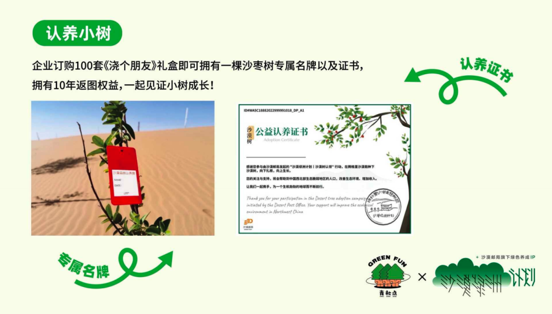 企业购买100套《浇个朋友》礼盒,即刻拥有一棵沙枣树专属名牌以及证书,且有用10年返图权益,见证小树成长。