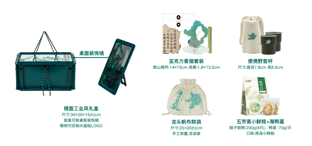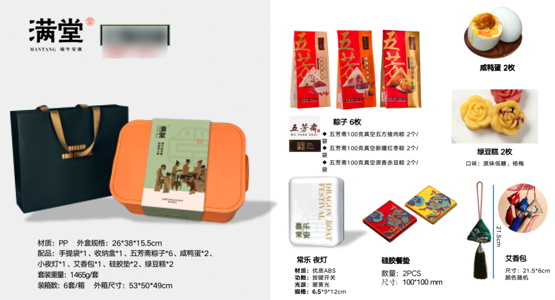 礼盒内含:收纳盒、五芳斋粽子、绿豆糕、咸鸭蛋、夜灯等
