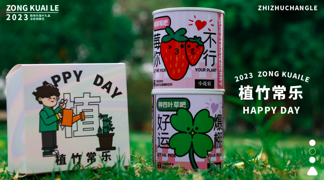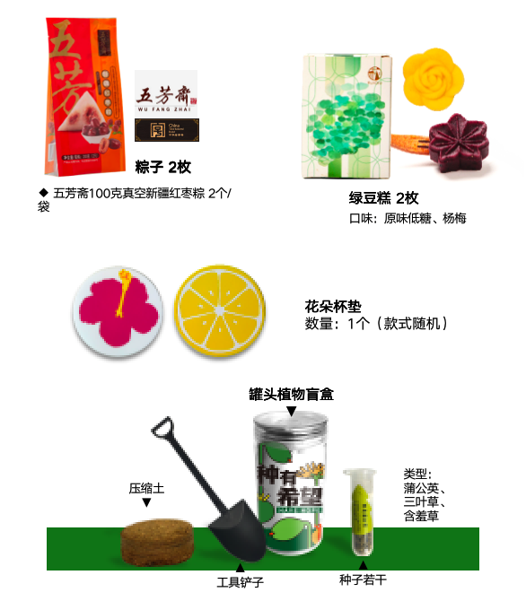 礼盒内含:罐头植物盲盒、花朵杯垫、粽子等