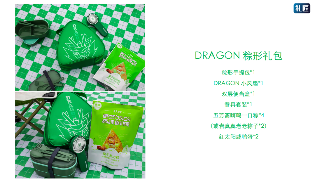 礼盒内含:粽形手提包、小风扇、便当盒、粽子等