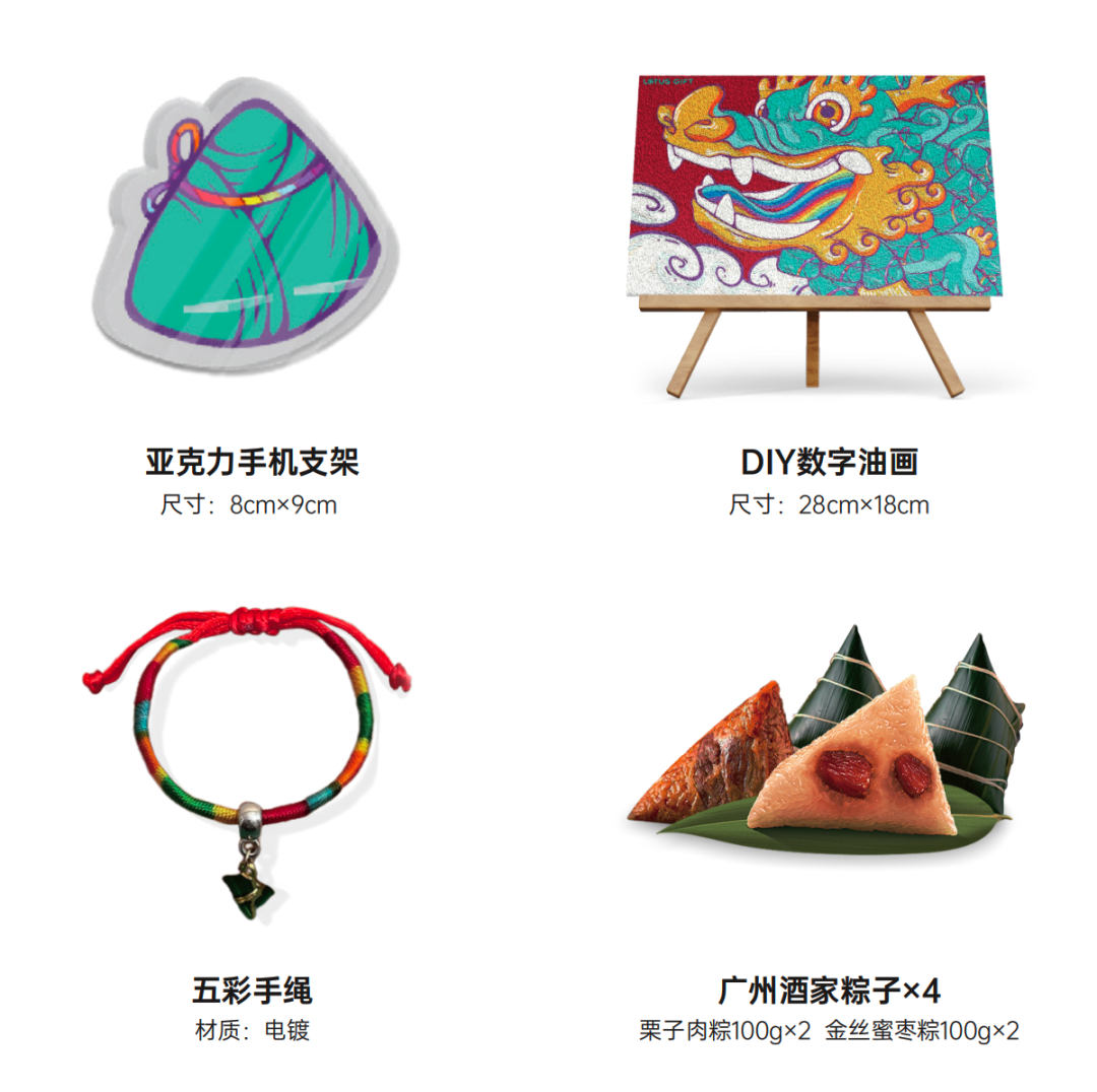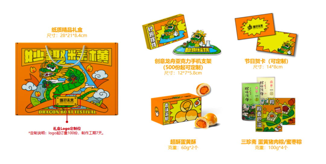 礼盒内含:三珍斋粽子(2种口味)、蛋黄酥、龙舟手机支架等