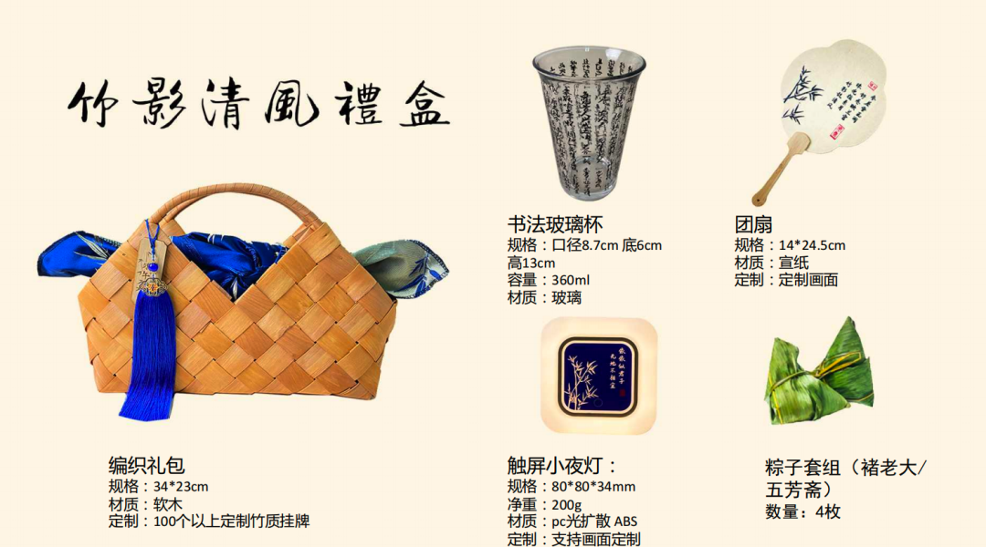礼盒内含:竹编篮、双面野餐布、小夜灯、粽子等