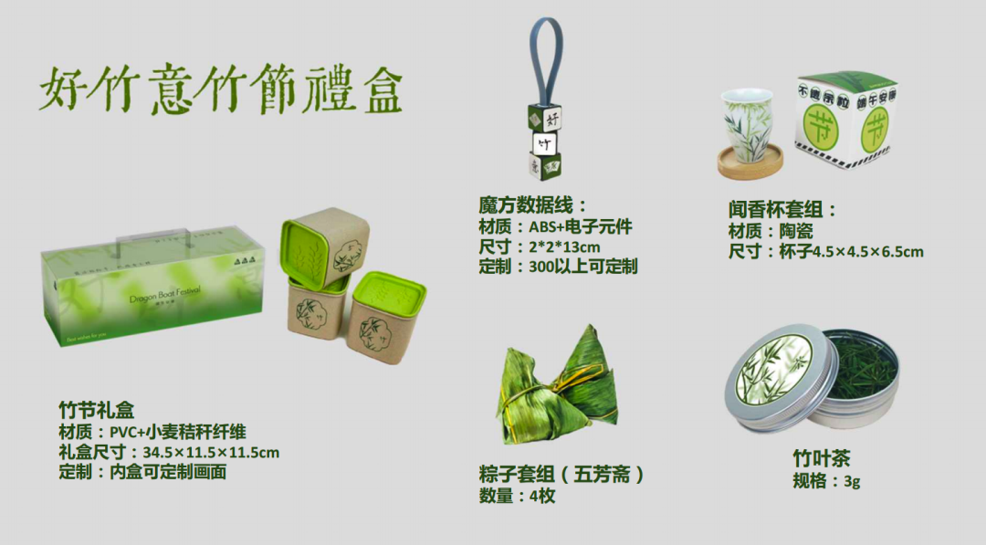 礼盒内含:便携茶杯、一罐茶、气囊手机支架、粽子等