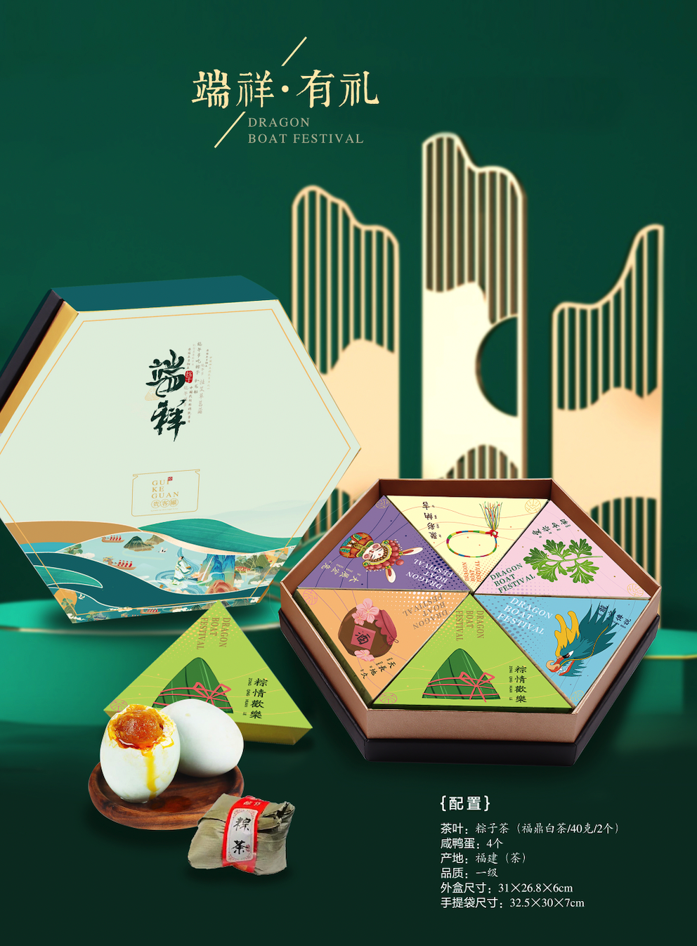 礼盒内含:粽子造型老白茶包、咸鸭蛋等