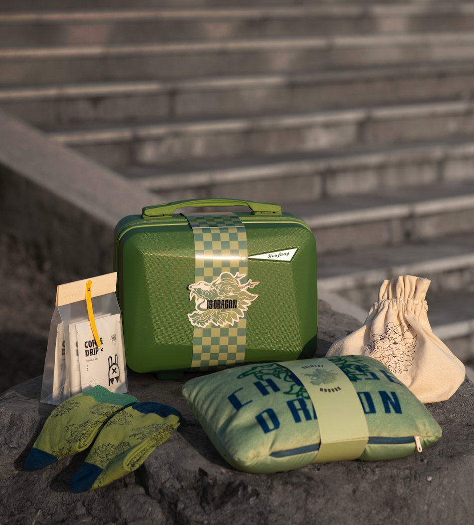 礼盒内含:绿色行李箱、便携野营杯、格纹龙头飞盘、两用脖枕等