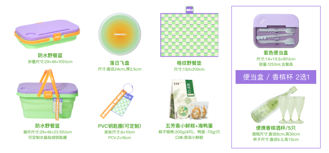 礼盒内含:防水野餐篮、落日飞盘、野餐垫、便当盒/香槟酒杯套装