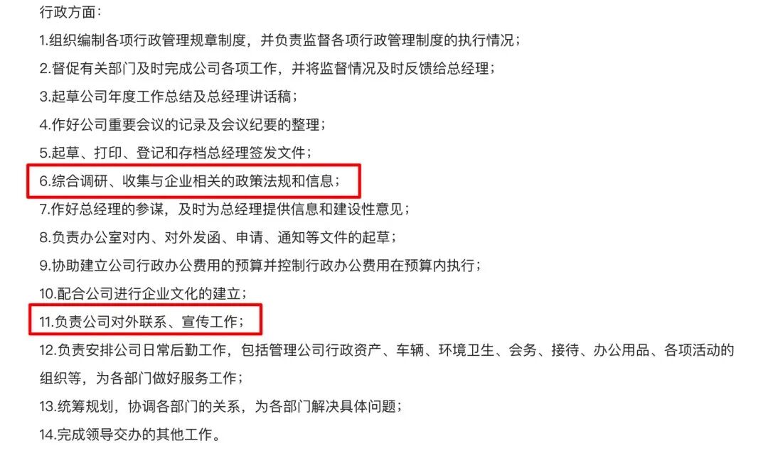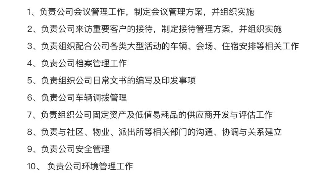 如果企业规模较小,很可能还需要行政经理承担一些执行工作,如装修选址、接待等。根据企业对岗位要求的不同,对行政经理人擅长的板块也会有侧重,譬如正在扩张阶段的企业可能会需要擅长装修选址的经理,而传统类型企业会希望行政经理能够擅长对外联系、公文写作等。