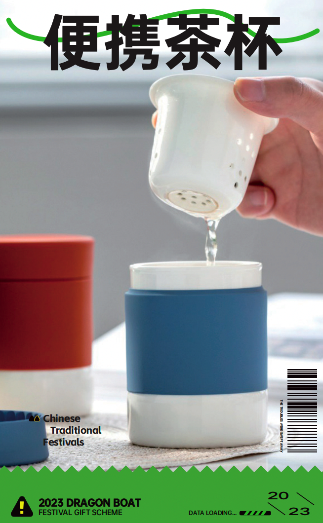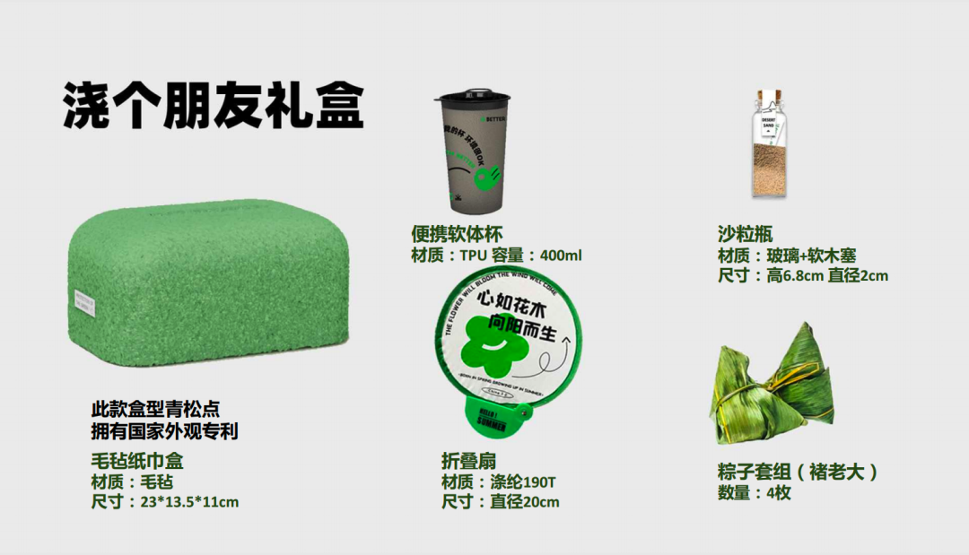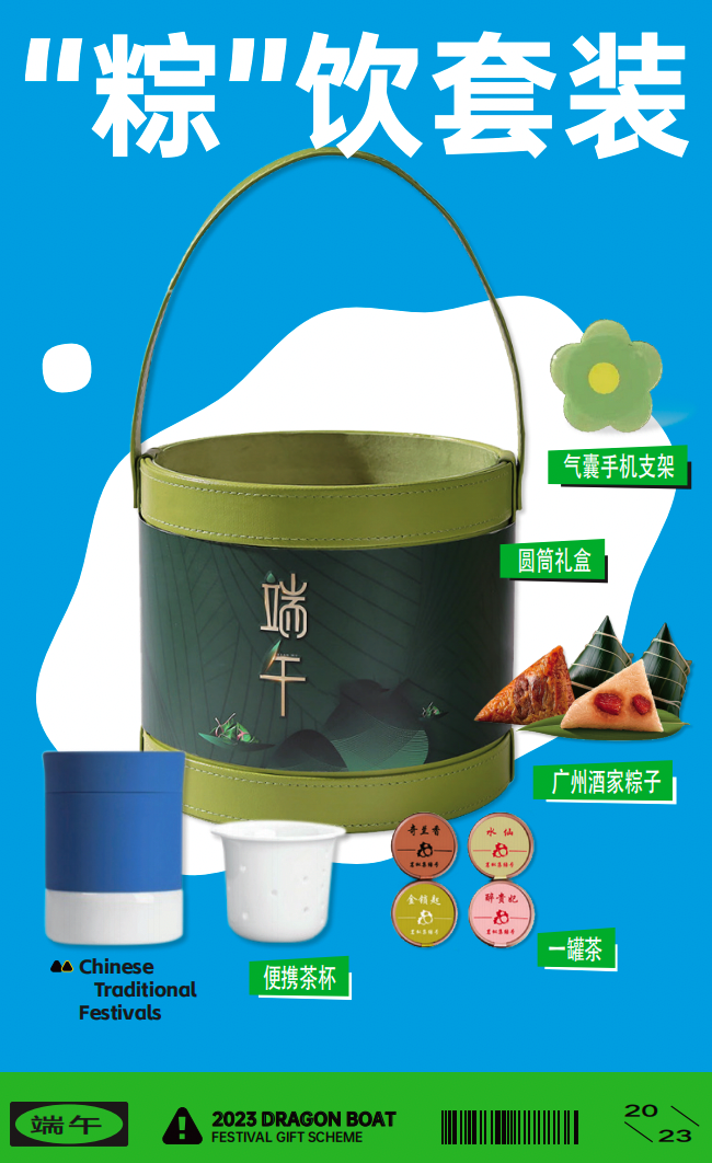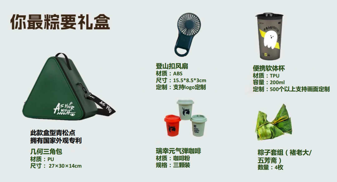 礼盒内含:便携茶杯、一罐茶、气囊手机支架、粽子等