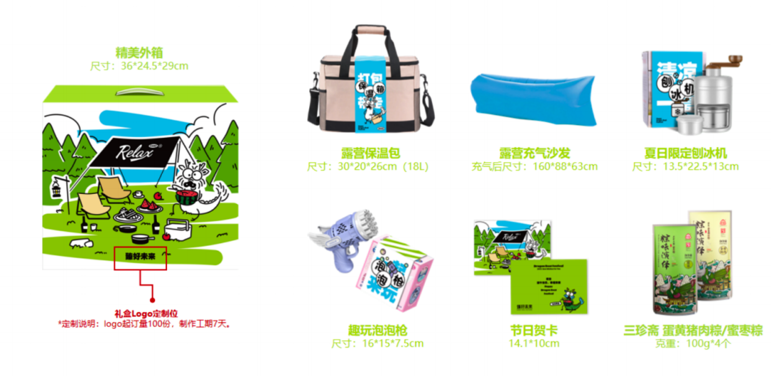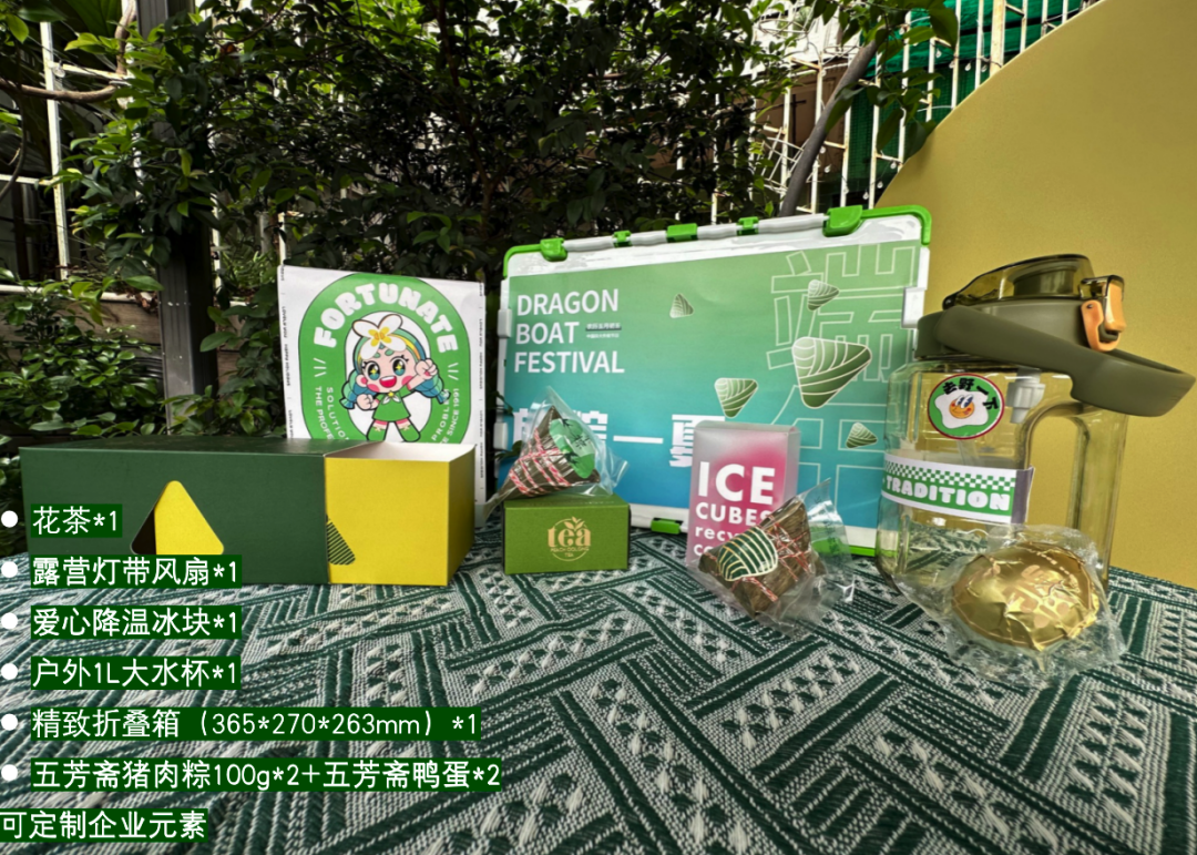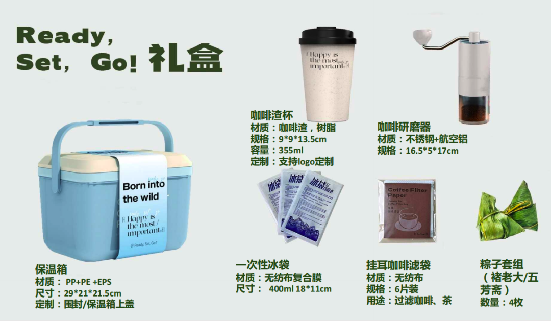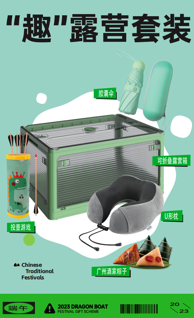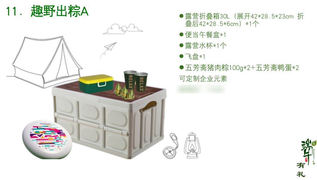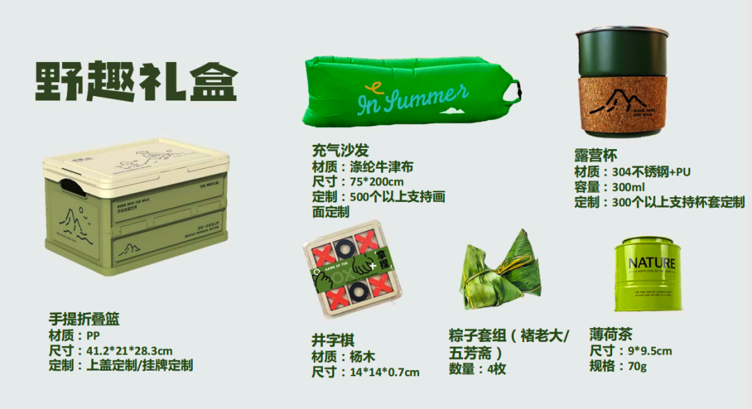 礼盒内含:折叠收纳箱、露营水杯、粽子等