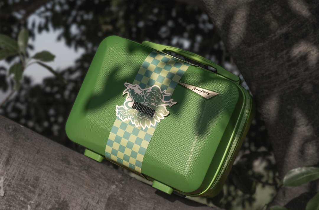 礼盒内含:绿色行李箱、便携野营杯、格纹龙头飞盘、两用脖枕等