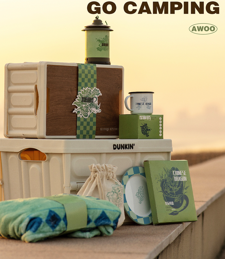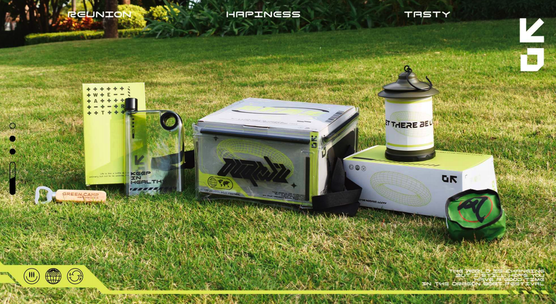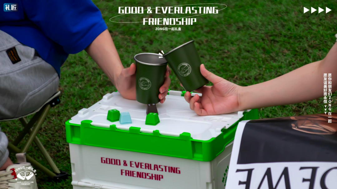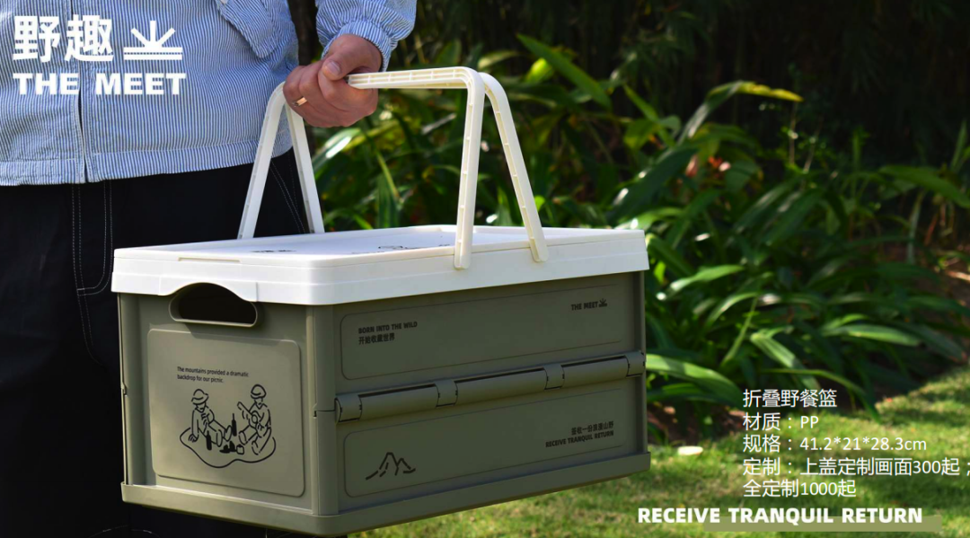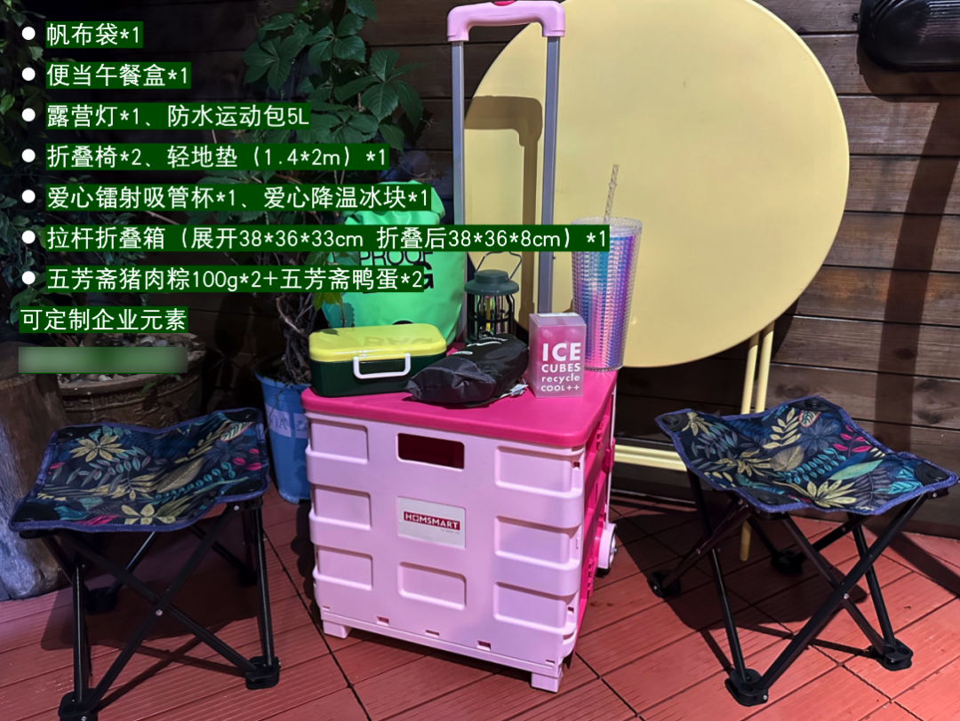 礼盒内含:折叠露营箱、背包野餐垫、刺绣蒲扇、开瓶器等