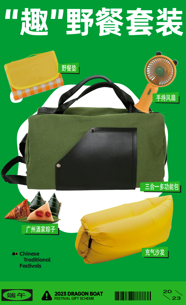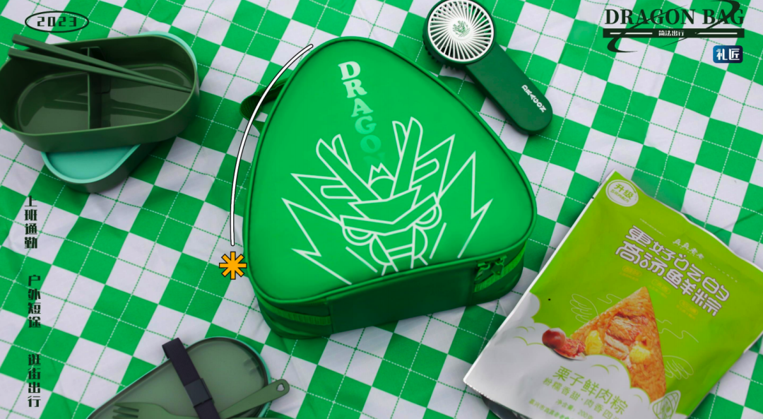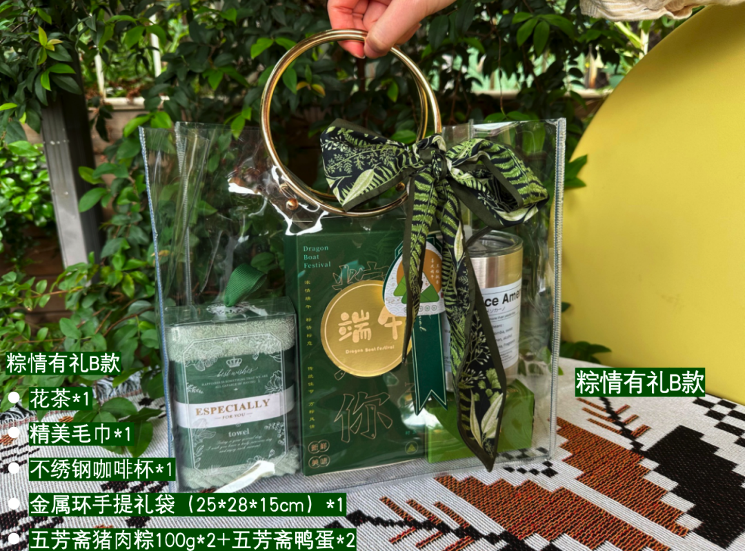 礼盒内含:粽形手提包、小风扇、便当盒、粽子等