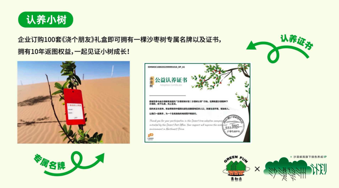企业购买100套《浇个朋友》礼盒,即刻拥有一棵沙枣树专属名牌以及证书,且有用10年返图权益,见证小树成长。