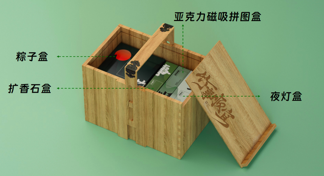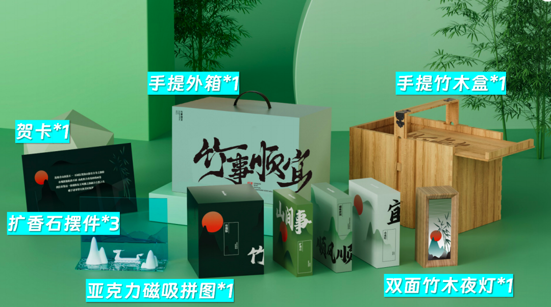 礼盒内含:手提竹木盒、双面竹木夜灯、扩香石摆件等