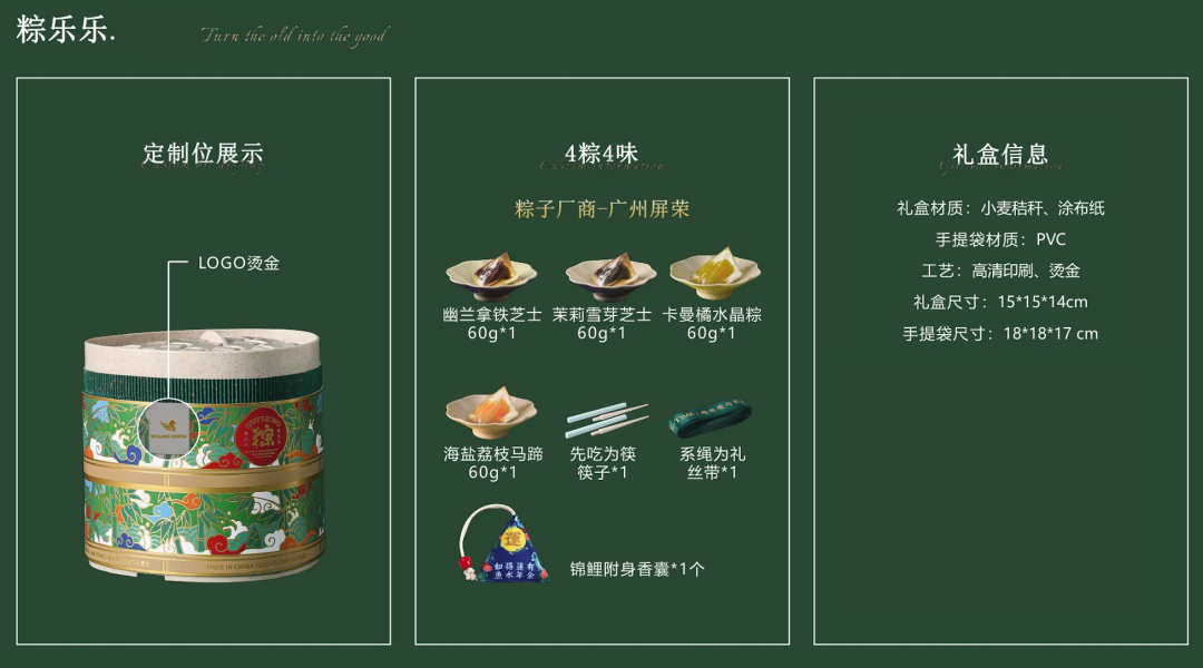 礼盒内含:诸老大粽子(2种口味)、打糕、乐乐茶、香薰牌等
