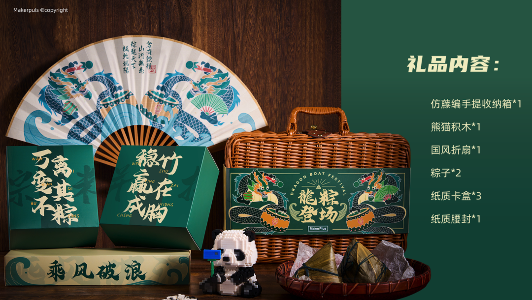 礼盒内含:手提收纳箱、熊猫积木、国风折扇、粽子等