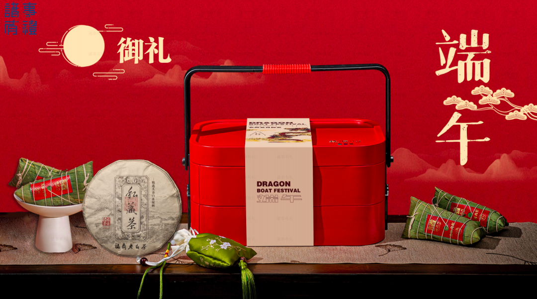 礼盒内含:马口铁收纳箱、诸老大粽子(3种口味)、福鼎白茶等
