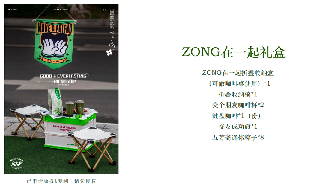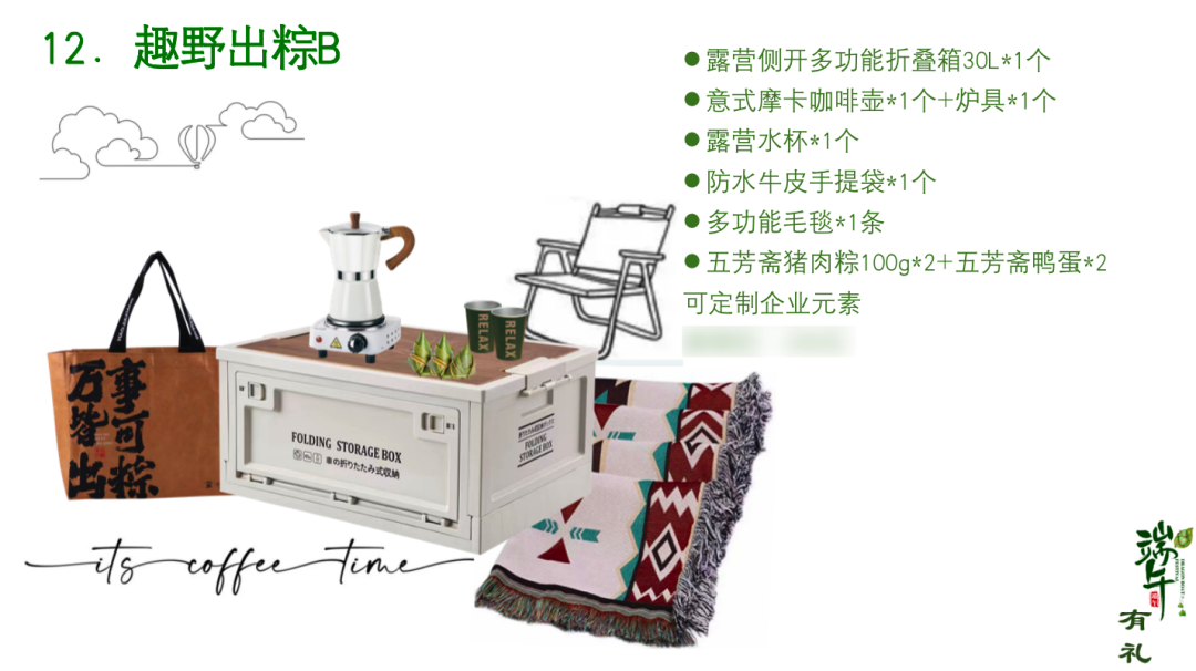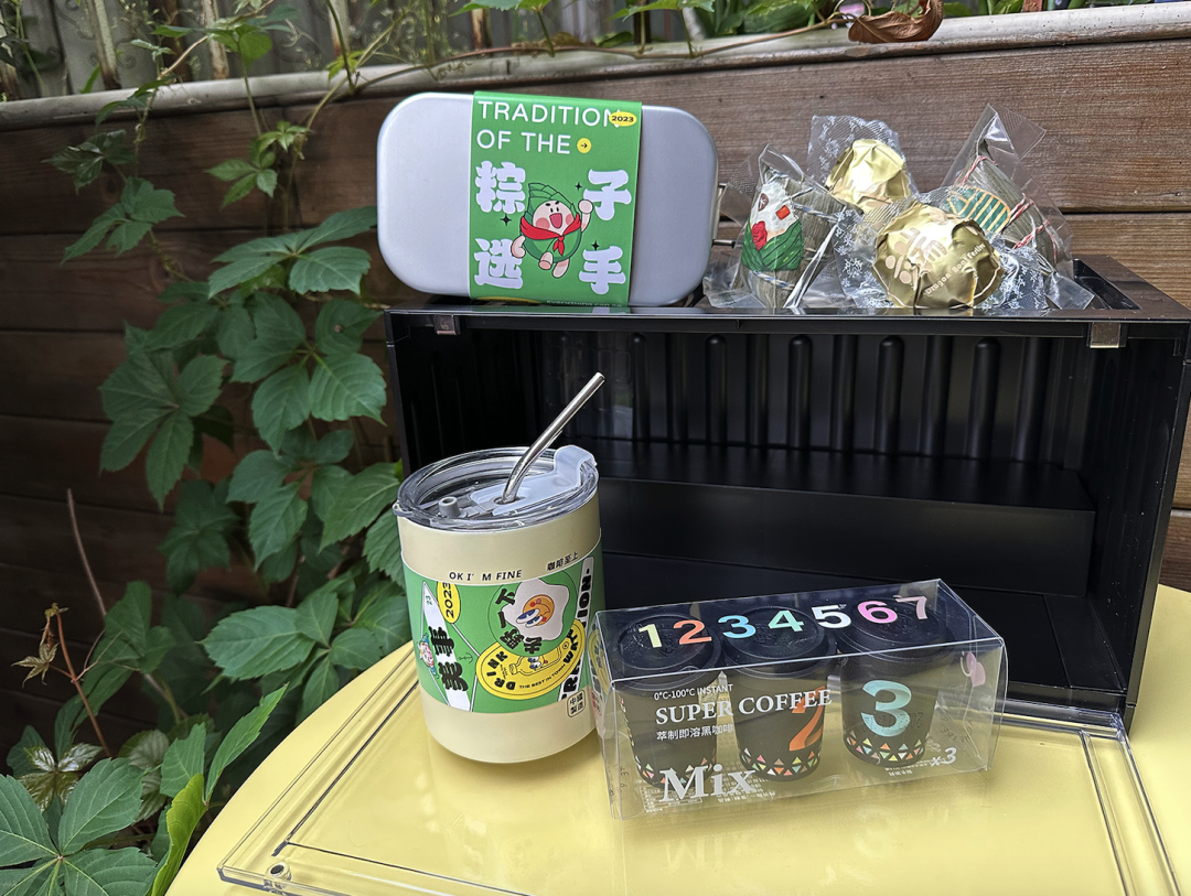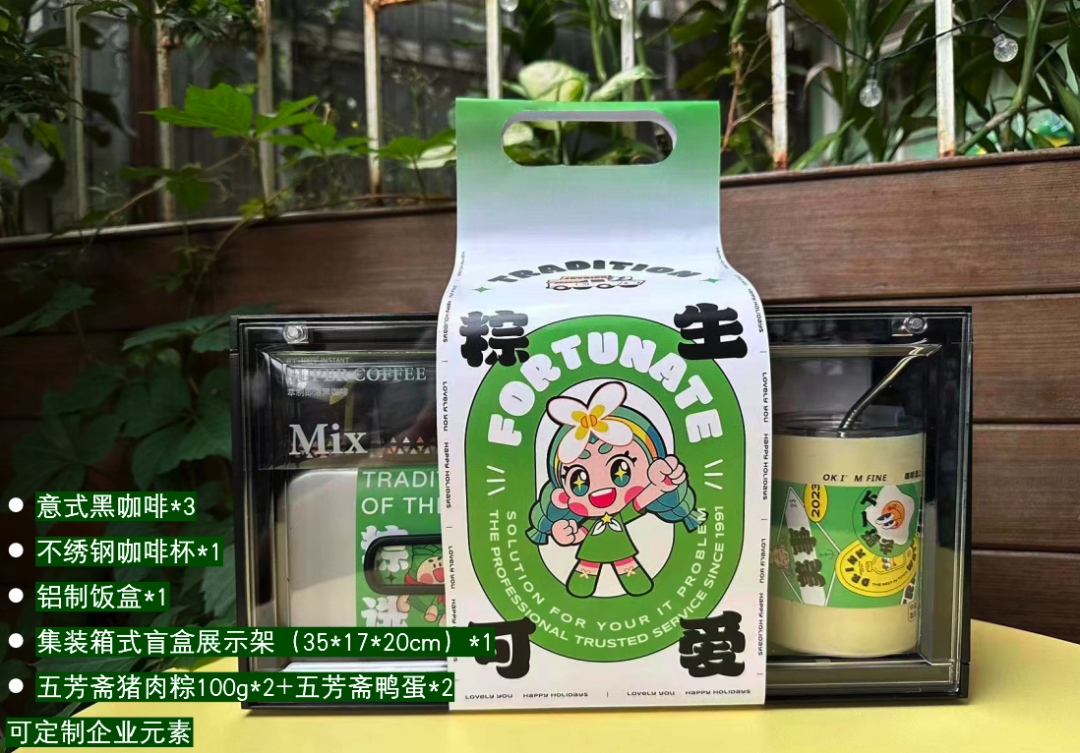 礼盒内含:折叠收纳箱、咖啡杯、咖啡、粽子等