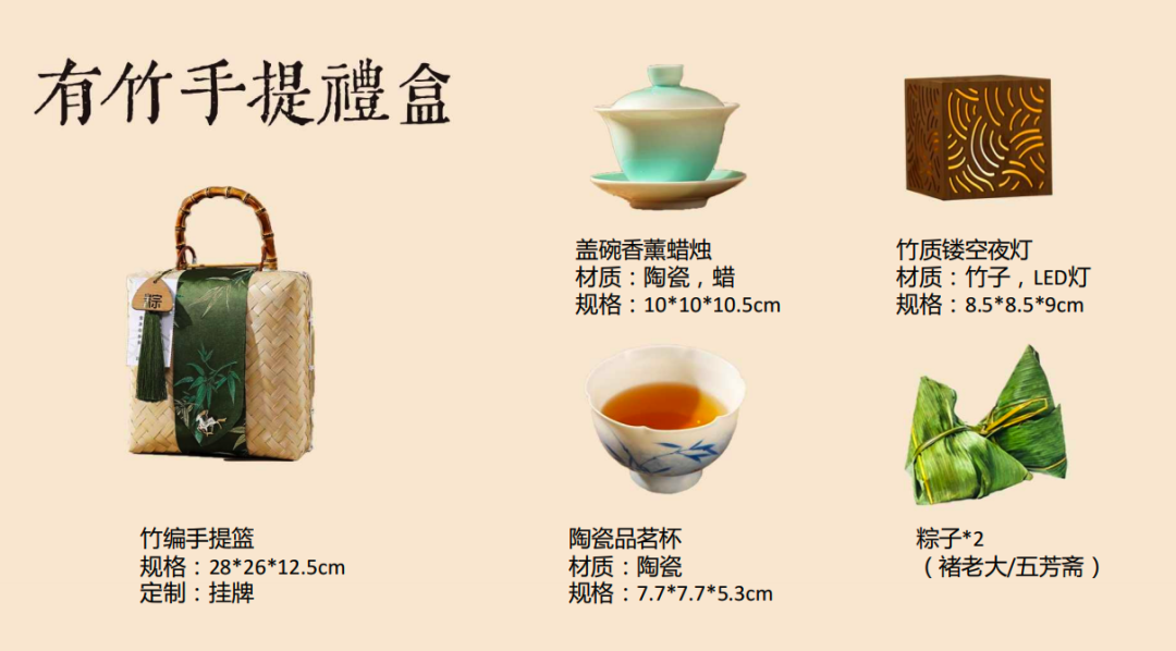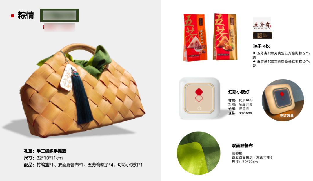 礼盒内含:竹编篮、双面野餐布、小夜灯、粽子等