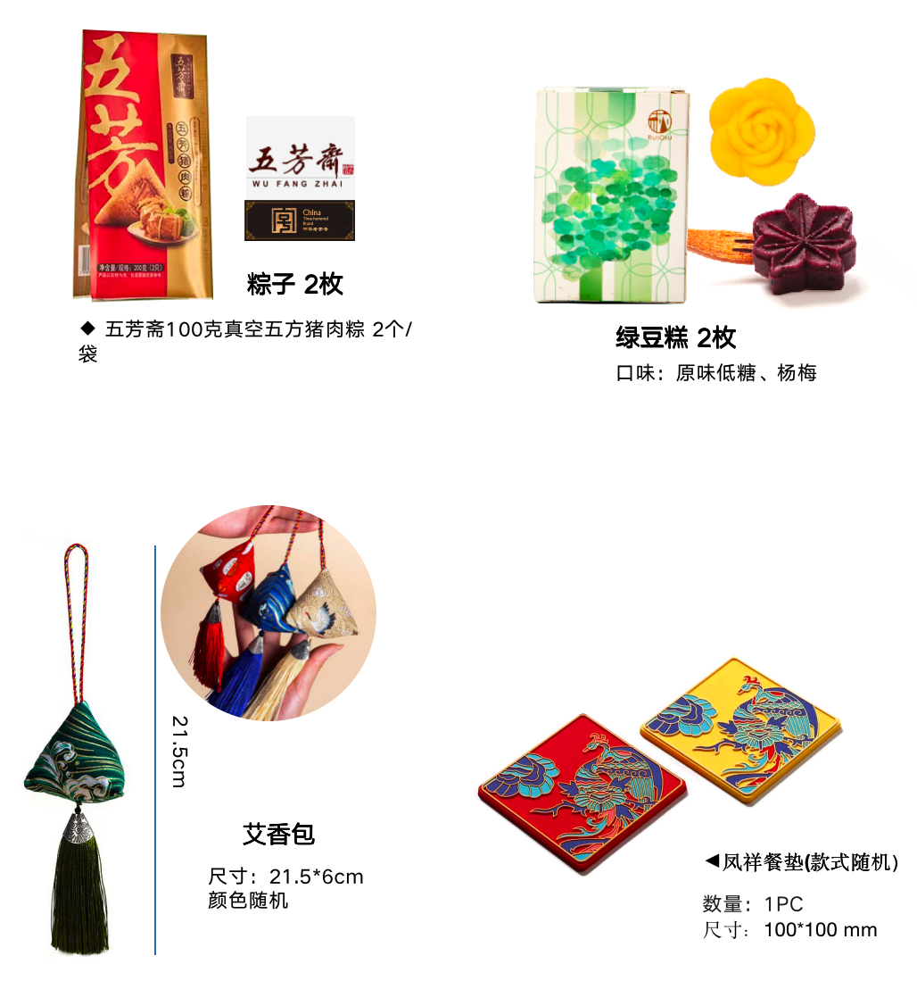 礼盒内含:五芳斋粽子、绿豆糕、艾香包等