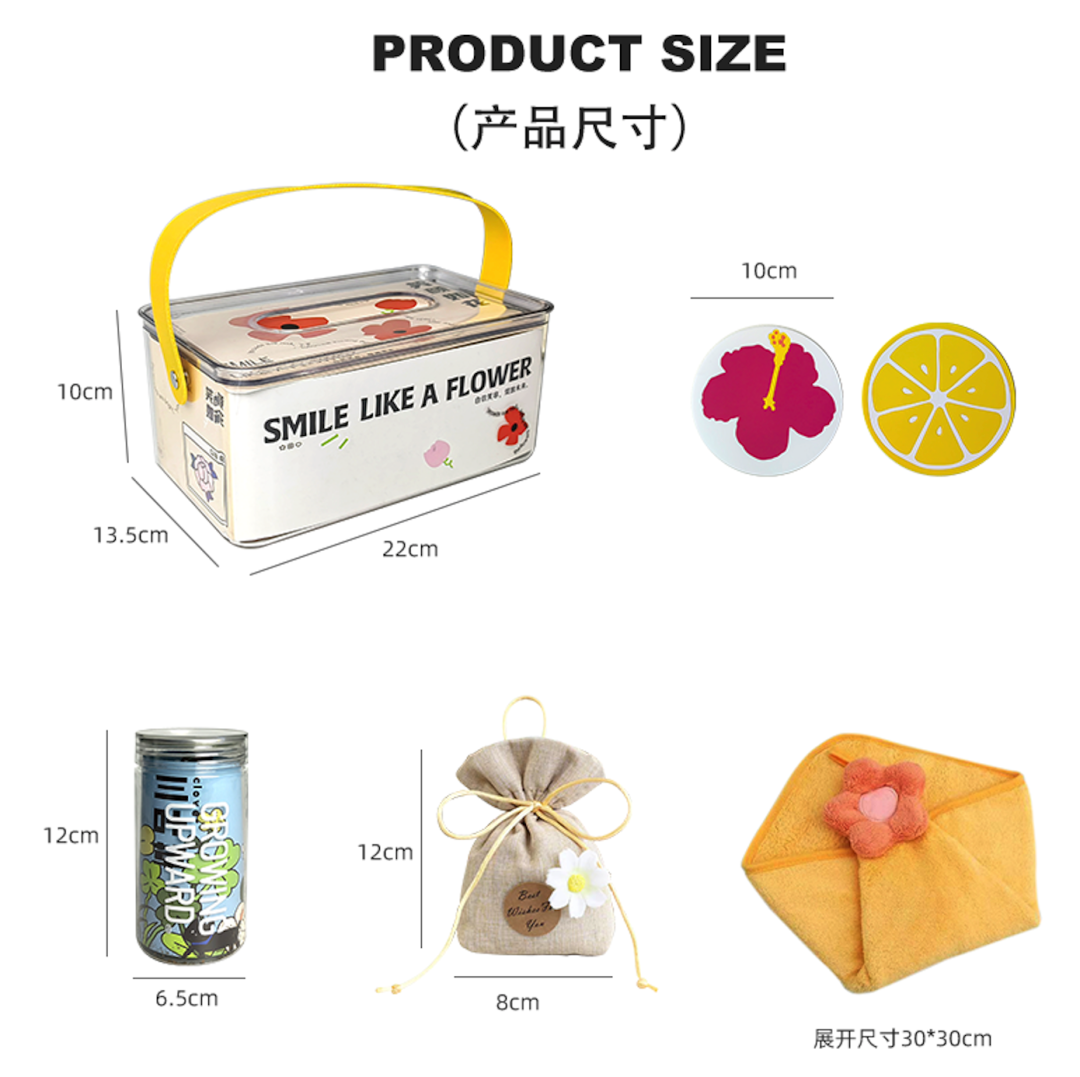 礼盒内含:收纳箱、杯垫、香囊、擦手巾、植物杯