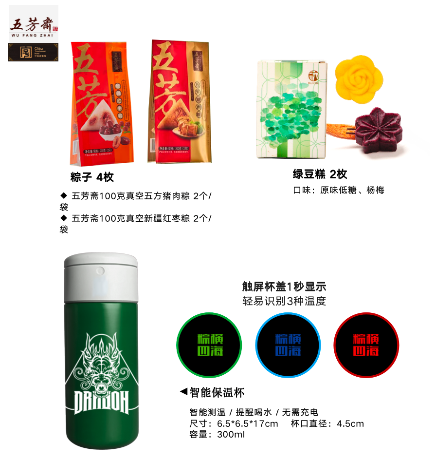 礼盒内含:斜挎包、智能保温杯、粽子、绿豆糕等