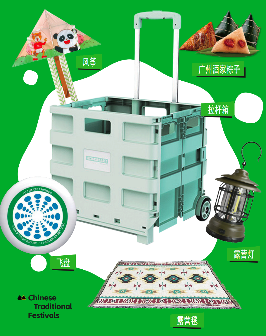 礼盒内含:风筝、飞盘、露营灯、拉杆箱、粽子等