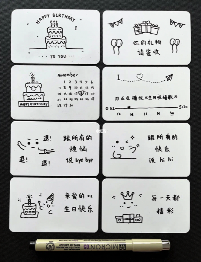 手巧的行政er可以像下图一样自己画一些简笔图案,增加贺卡观赏性;员工人数多的朋友可以直接购买印有图案的空白贺卡,甚至可以将祝福语用手写体打印出来,高效搞定。