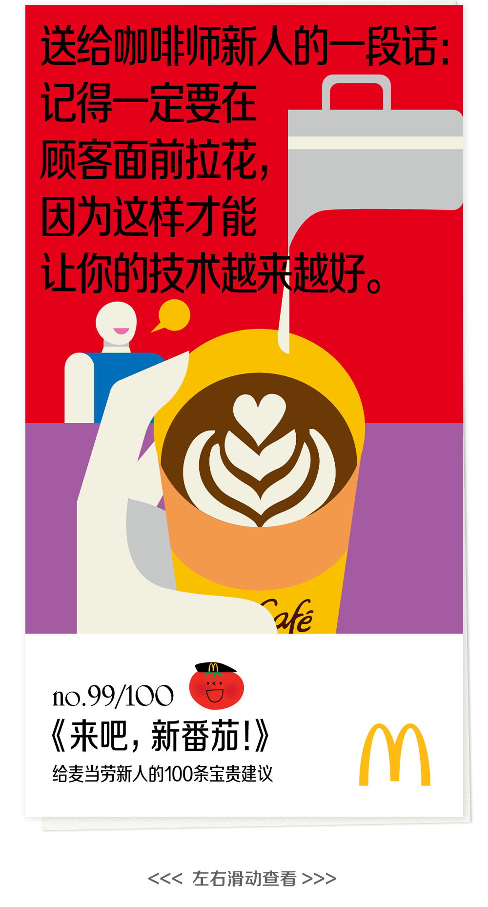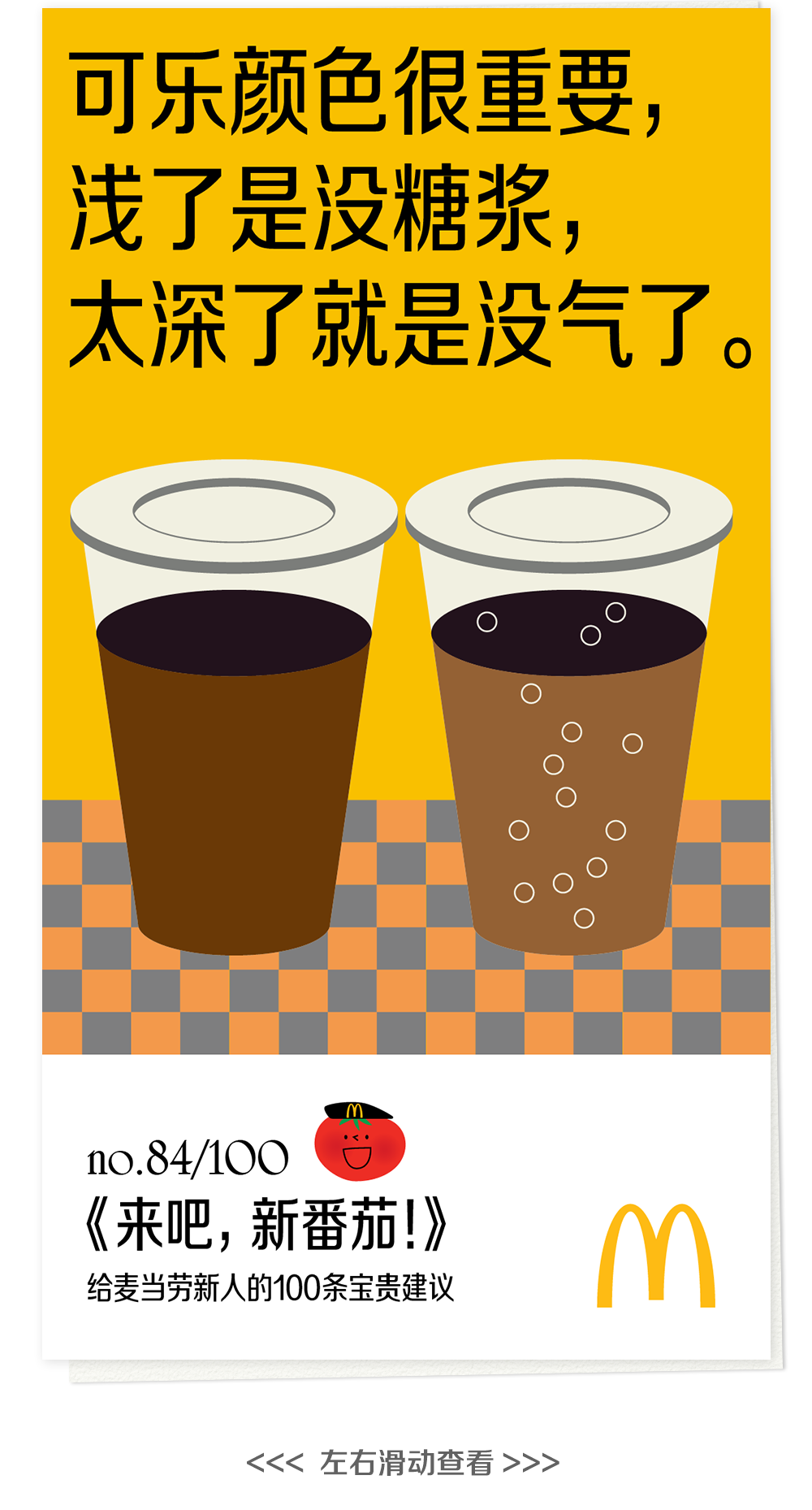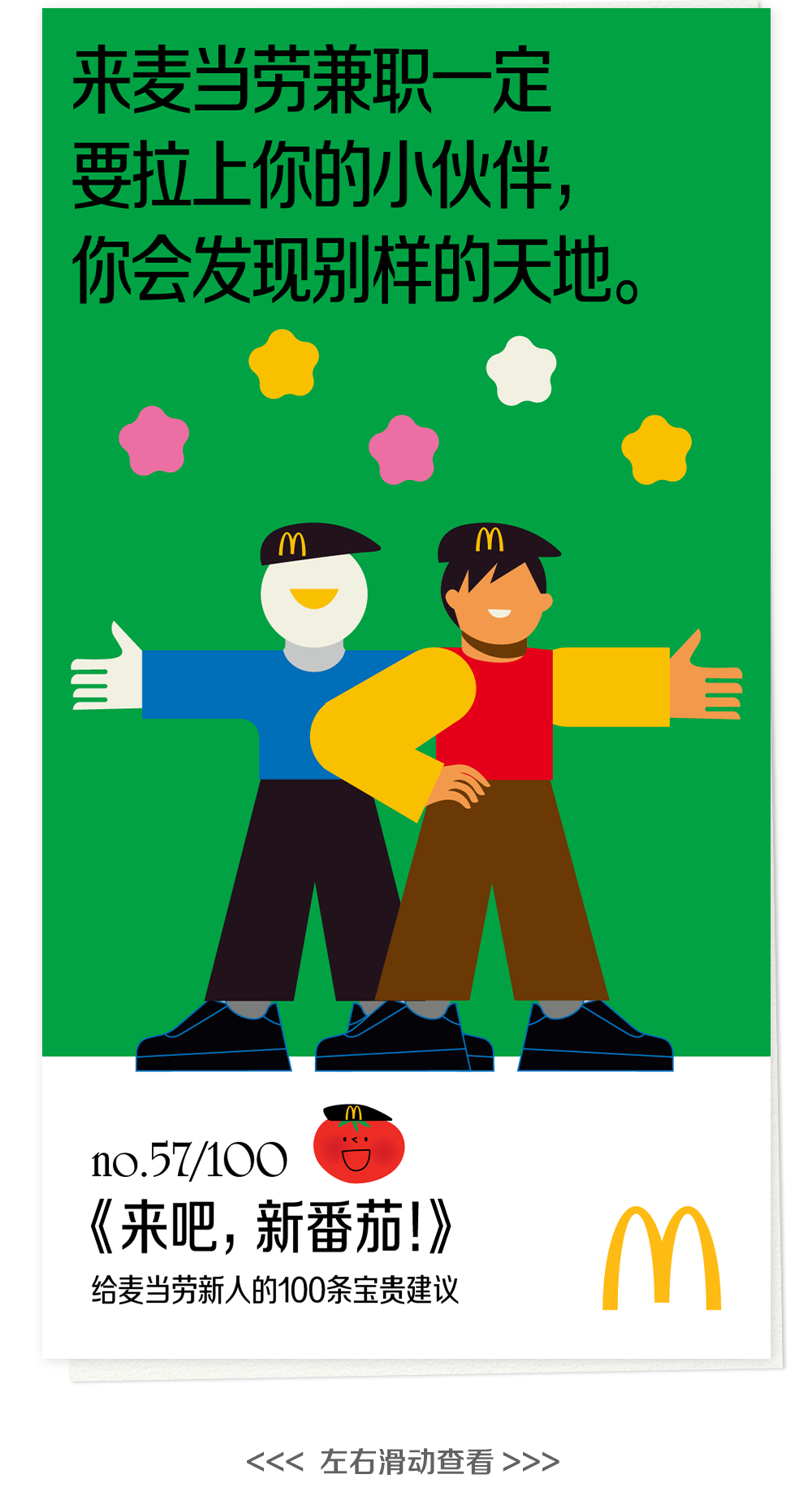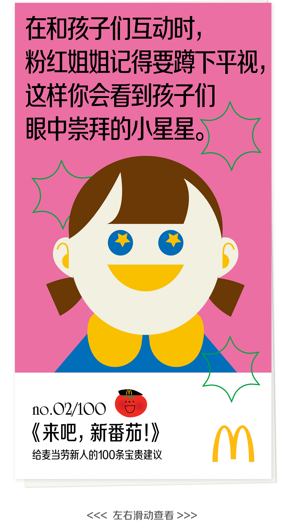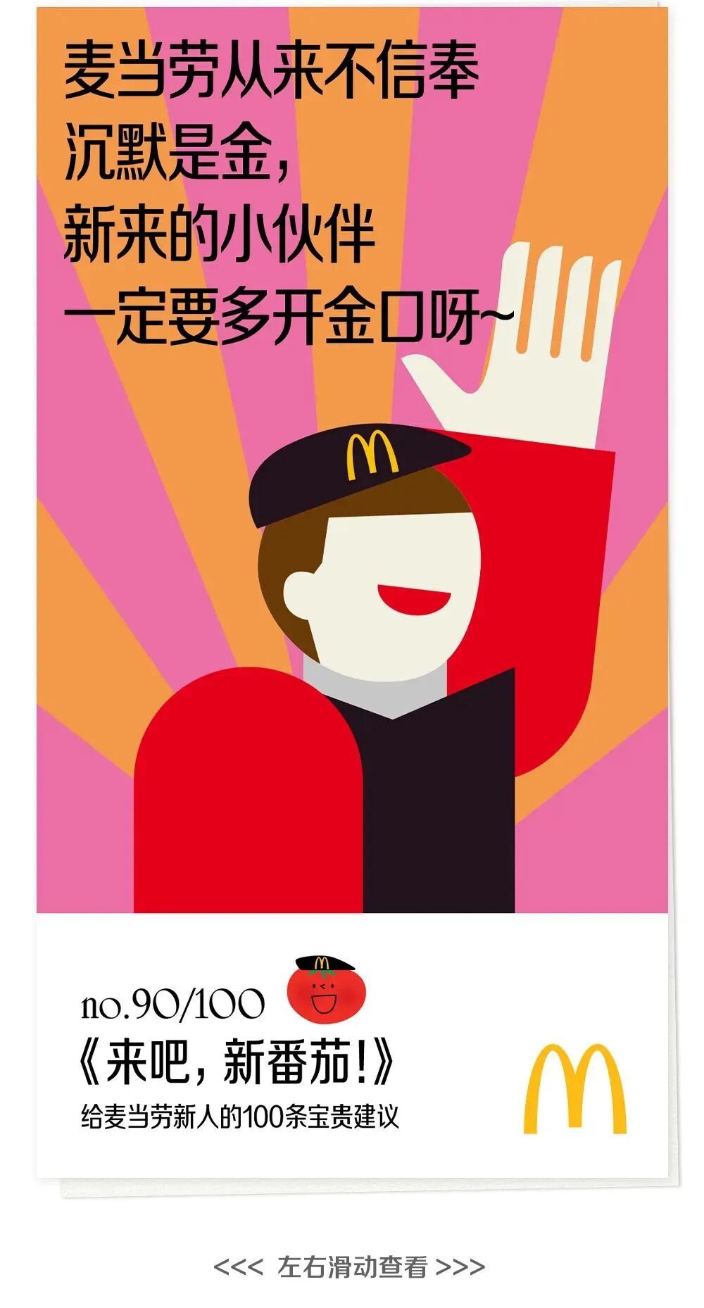 麦当劳在“520全国招聘周”发布的麦当劳新员工入职手册《来吧,新番茄!》,这份给麦当劳新人的100条宝贵建议,画风明亮可爱,建议有趣实用,充满麦当劳独有的温暖。