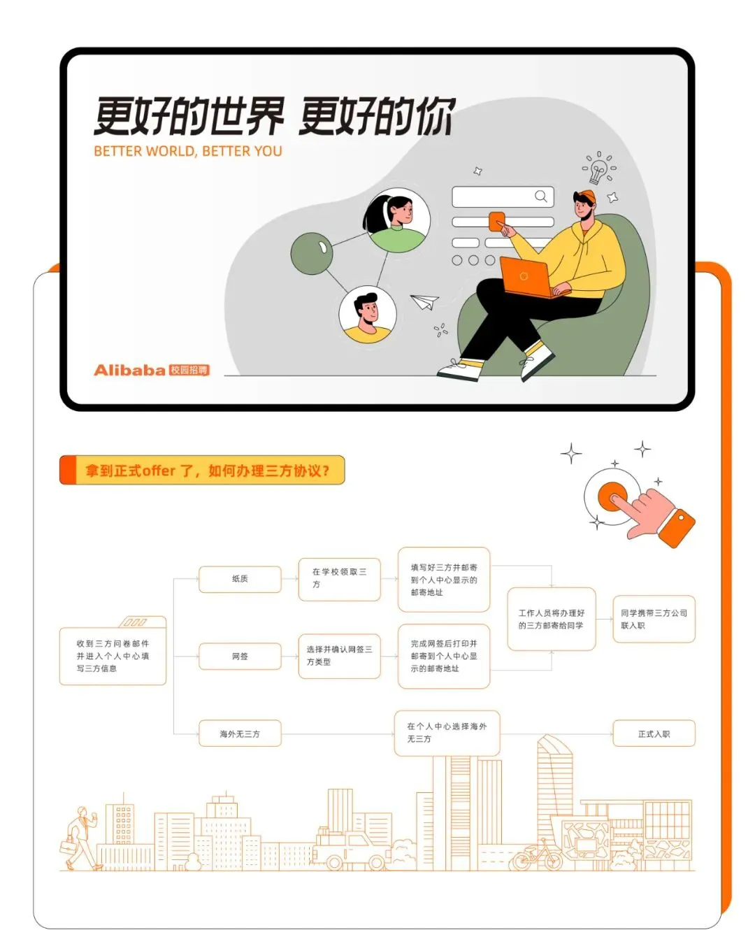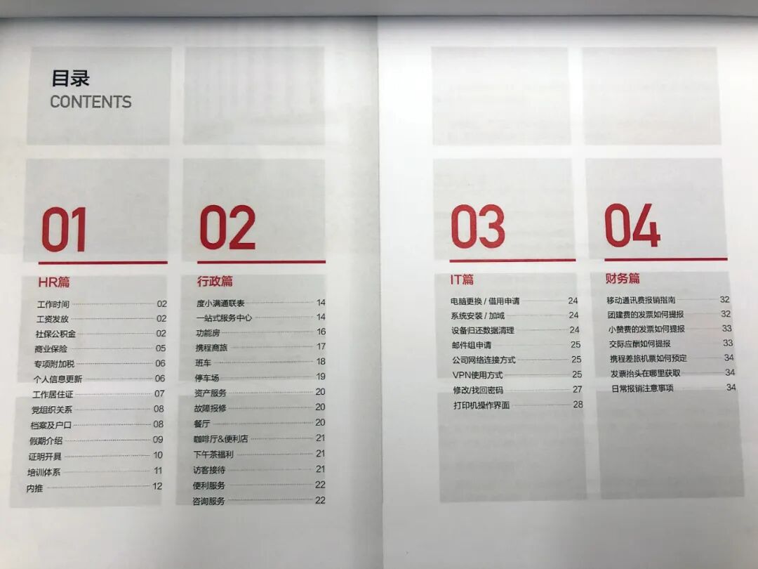 阿里巴巴的入职手册为萌新分块总结「快乐工作篇」、「认真生活篇」,快乐工作篇主要讲述员工入职规定、企业制度、企业文化、薪酬体系等内容,还有阿里丰富多样的企业培训福利,认真生活篇内含萌新租房找房、住房补贴、员工福利、交通出行、通讯方面等服务指南,还有萌新们关心的三方协议如何办理、报销流程及发票要求。