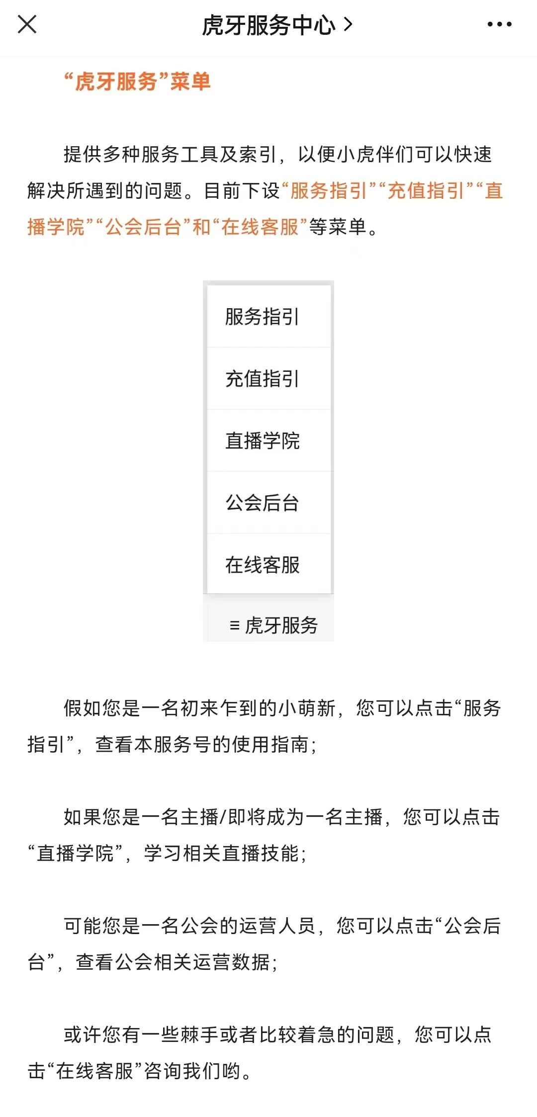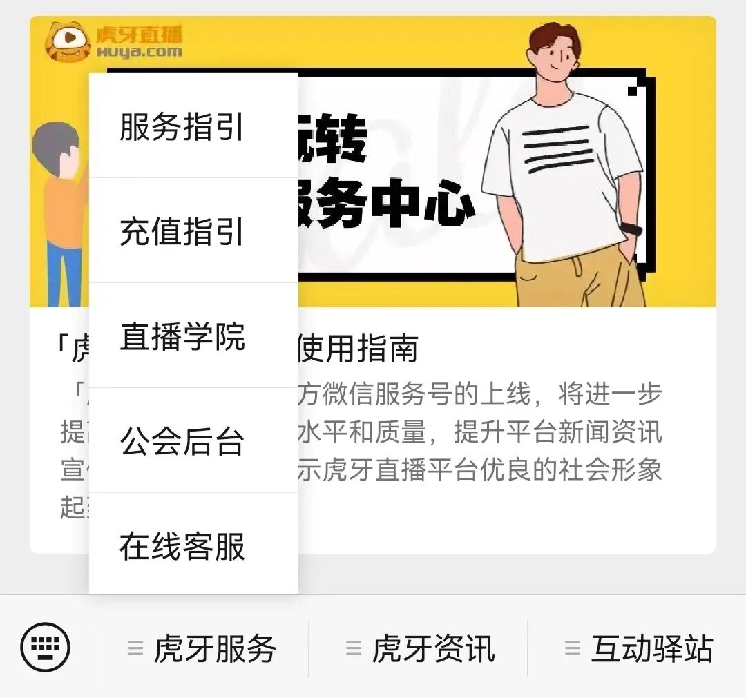 虎牙的行政团队专门打造了一个「虎牙服务中心」公众号,菜单的「虎牙服务」一栏就涵盖行政服务指引——「服务指引」+「充值指引」等5个子菜单。