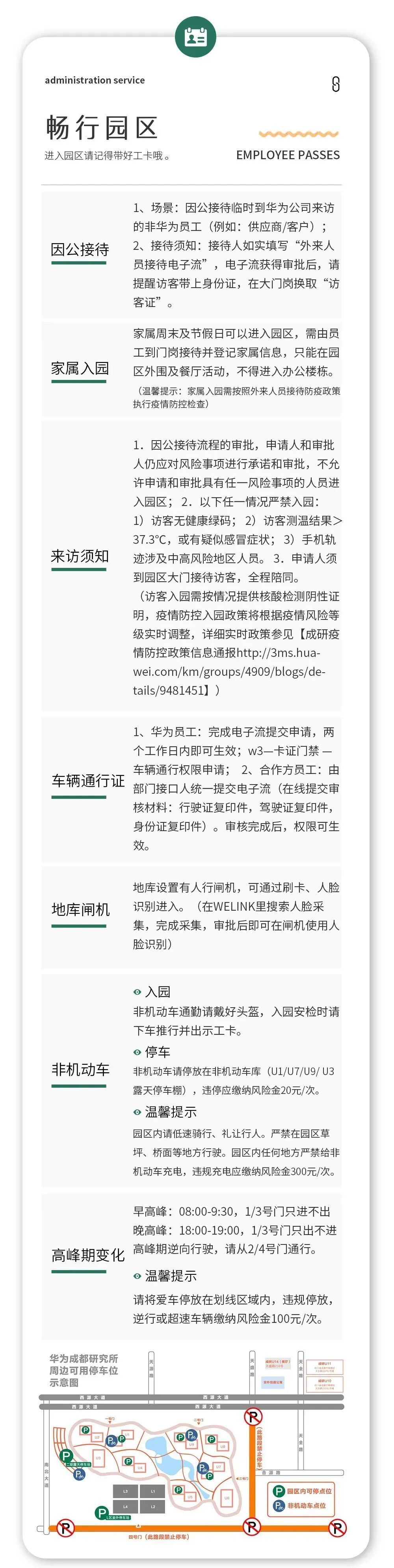 在通行版块中不仅以不同情景进行划分方便员工查找,还在末尾贴心加入周边可用停车位示意图,让服务更有温度~