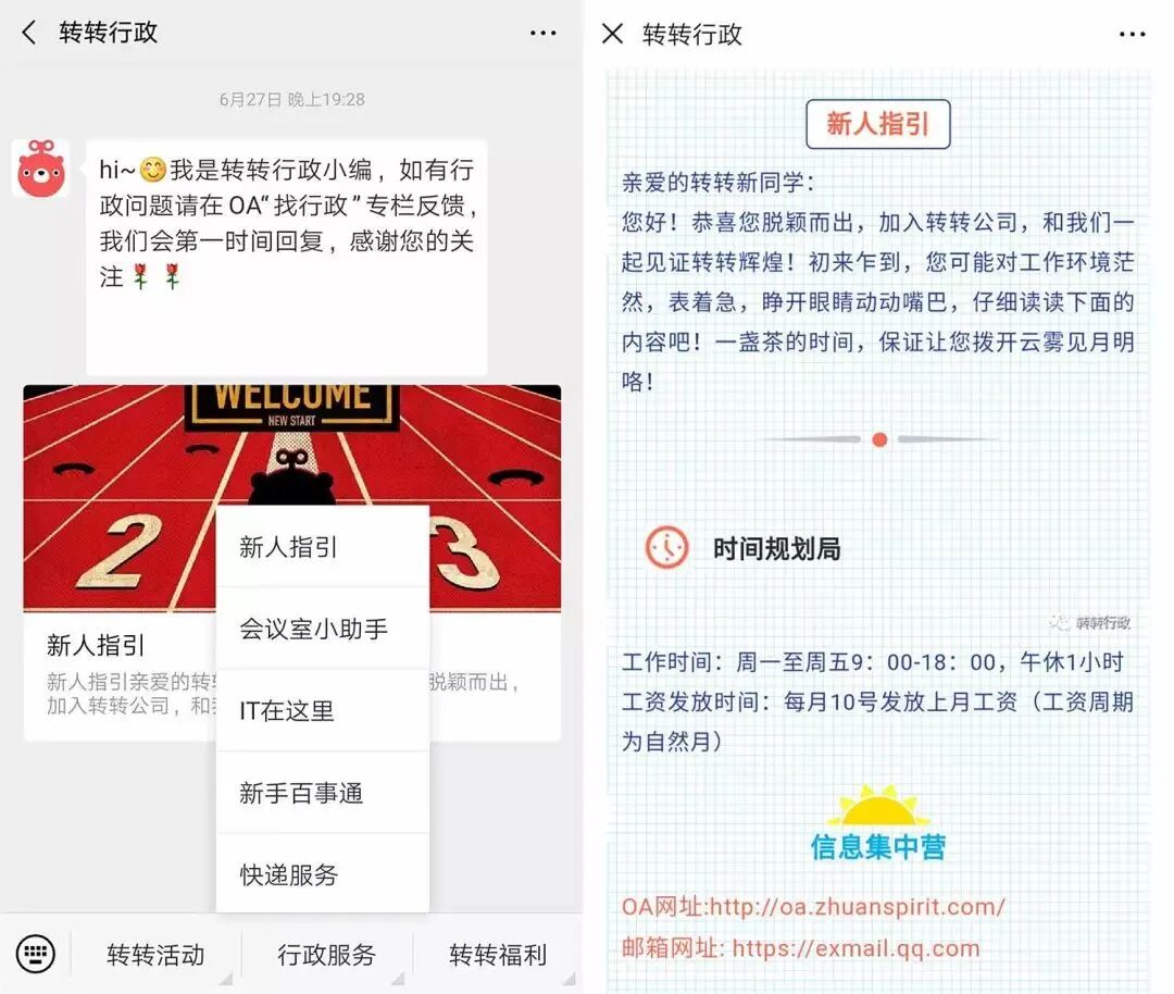 用公众号来进行入职服务指引也是很方便快捷的方式,既可以使用菜单服务引导,也可以推文发布新人攻略。