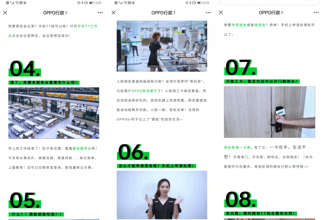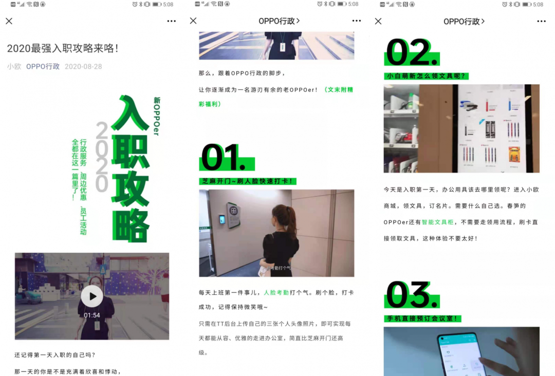 OPPO则专门出了一篇详细的推文来讲述新人入职攻略,从刷脸打卡、领取纸笔等行政服务,到周边优惠、员工活动详细囊括在内,一文在手,即可变身游刃有余的老OPPOer。